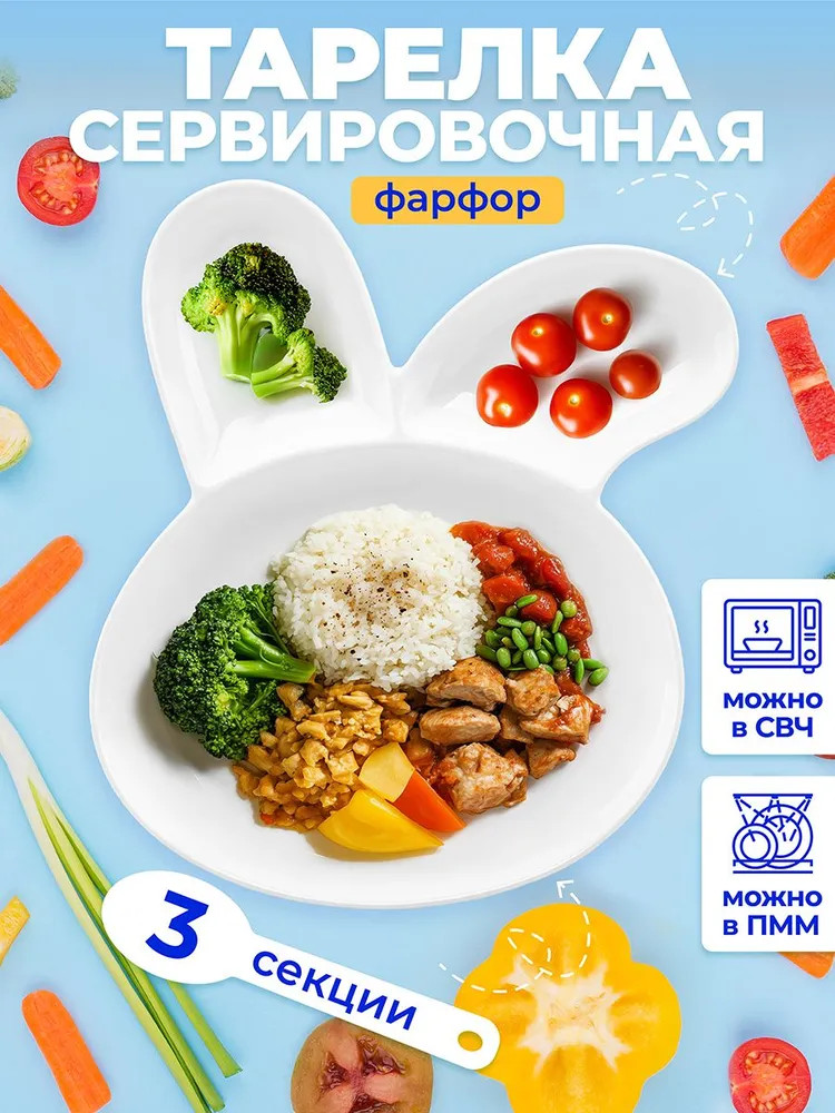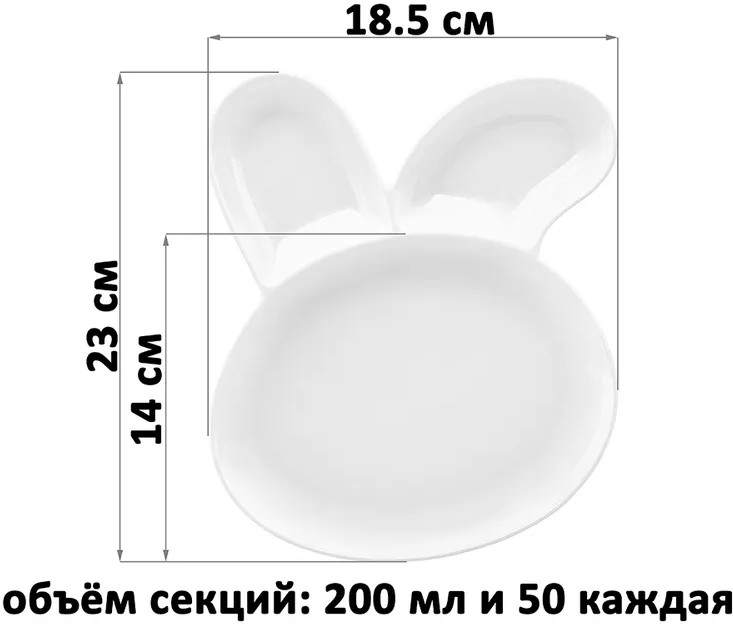 Тарелка-менажница «Заяц» предназначена для сервировки стола. Имеет три секции. Размер изделия — 23×18.5×2.5 см. Объём большой секции — 200 мл, маленьких — 50 мл каждая. Фигурная тарелка выполнена из высококачественного белого фарфора в виде кролика с опущенным ушком. Фарфор не впитывает цвет продуктов и легко отмывается, благодаря чему надолго сохранит свою белизну. Светлая Пасха — один из главных праздников весны! Мы разработали коллекцию сезонных товаров для дома, которые помогут создать радостную и уютную атмосферу в квартире или на даче. Пасхальный декор преобразит домашний интерьер и поможет встретить праздник в кругу любимых. Поставьте изделие в виде пасхального животного на праздничный стол, чтобы дополнить тематическую сервировку. Используйте для подачи обедов, закусок и десертов. Заполните большую секцию горячим блюдом, а маленькие — салатом, свежей зеленью или сладкими закусками для приятного перекуса. Блюдо подойдёт для ценителей правильного питания: секции позволят контролировать количество каждого продукта.