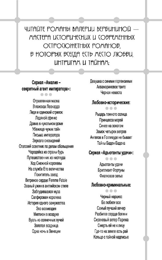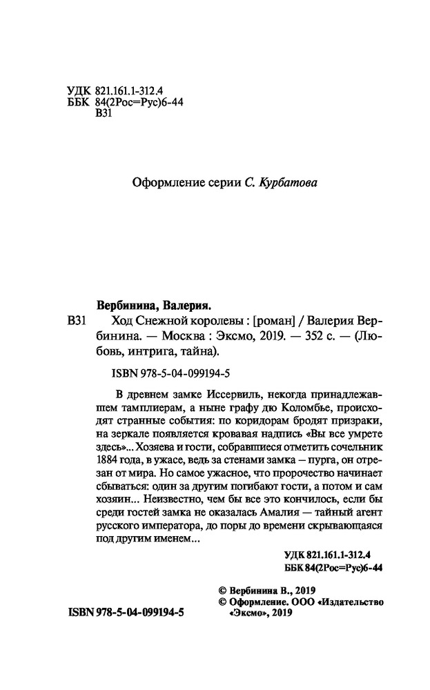 Ход Снежной королевыВ данный момент этот товар отсутствует в продаже. Возможно, у нас найдется аналогичный или похожий товар здесь. Серия: Любовь, интрига, тайна. Романы И. Мельниковой и В. Вербининой (обложка) В древнем замке Иссервиль, некогда принадлежавшем тамплиерам, а ныне графу дю Коломбье, происходят странные события: по коридорам бродят призраки, на зеркале появляется кровавая надпись «Вы все умрете здесь»... Хозяева и гости, собравшиеся отметить сочельник 1884 года, в ужасе, ведь за стенами замка — пурга, он отрезан от мира. Но самое ужасное, что пророчество начинает сбываться: один за другим погибают гости, а потом и сам хозяин... Неизвестно, чем бы все это кончилось, если бы среди гостей замка не оказалась Амалия — тайный агент русского императора, до поры до времени скрывающаяся под другим именем... |