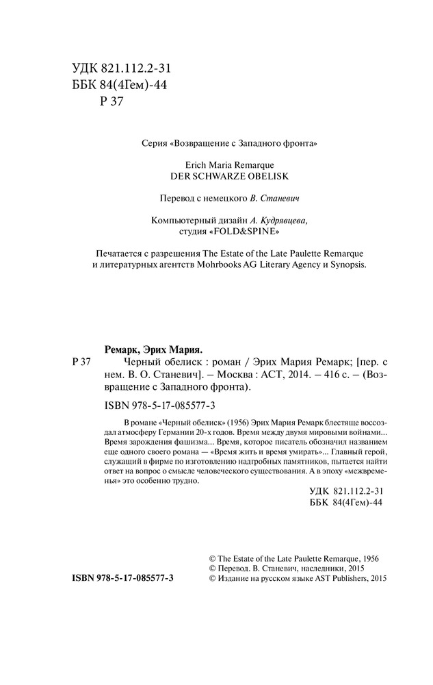 Черный обелискбумага плотная обложка издание В данный момент этот товар отсутствует в продаже. Возможно, у нас найдется аналогичный или похожий товар здесь. Серия: Возвращение с Западного фронта В романе «Черный обелиск» (1956) Эрих Мария Ремарк блестяще воссоздал атмосферу Германии 20-х годов. Время между двумя мировыми войнами… Время зарождения фашизма… Время, которое писатель обозначил названием еще одного своего романа — «Время жить и время умирать»… Главный герой, служащий в фирме по изготовлению надгробных памятников, пытается найти ответ на вопрос о смысле человеческого существования. А в эпоху «межвременья» это особенно трудно. |