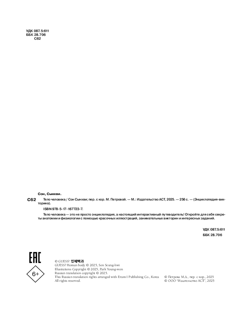 Серия: Энциклопедия-викторина Тело человека — это не просто энциклопедия, а настоящий интерактивный путеводитель! Откройте для себя секреты анатомии и физиологии с помощью красочных иллюстраций, занимательных викторин и интересных заданий. |