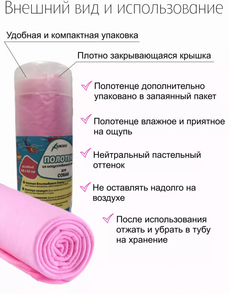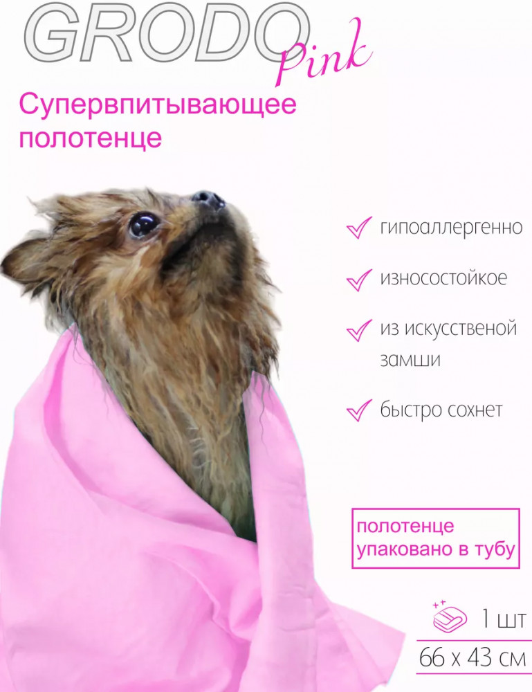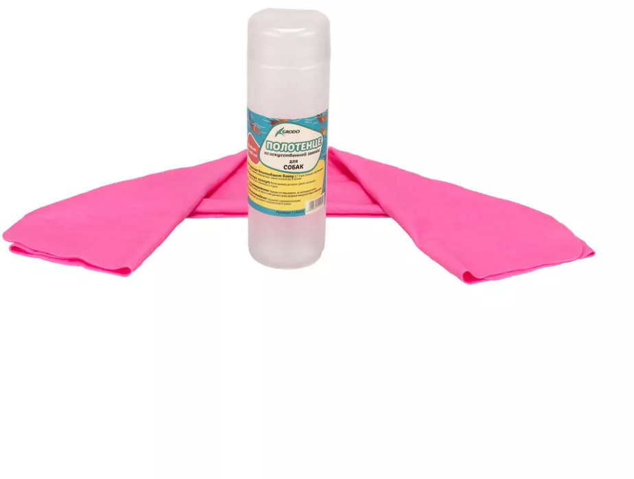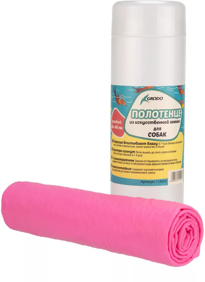 Полотенце Grodo из искусственной замши (микрофибра) впитывает влаги в 7-9 раз больше собственного веса. Тонкое, легкое, компактное. Удобно, чтобы просушить вашего питомца после купания или прогулки. За пару минут соберет влагу. Упаковано в герметичный пакет внутри пластмассовой тубы. Хранить на воздухе не рекомендуется. Материал микрофибры позволяет легко выжать полотенце до почти сухого состояния. Хорошо отстирывается, из материала легко удаляются пятна. Износостойко, сохраняет хороший внешний вид и работает до полного механического износа. Также можно использовать для других животных: кошки, хомяка, кролика, шиншиллы, морской свинки. Для питомца небольшого размера можно разрезать супервпитывающее полотенце на две части. Материал EVA устойчив к растяжению и скручиванию. Размер полотенца 66×43 см.