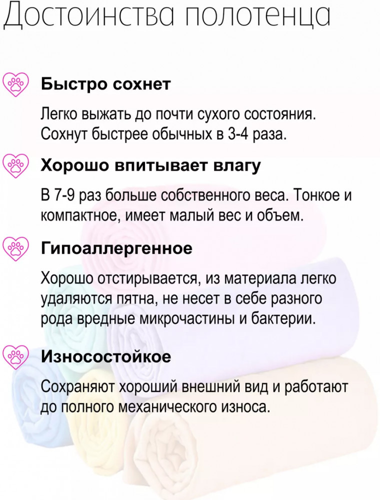 Быстро высушить животное и избежать возникновения неприятного запаха поможет специальное полотенце для собак из микрофибры.Полотенца из микрофибры очень быстро высыхают и, в отличии от натуральных материй, им не присущ неприятный «затхлый» запах. Приятные тактильные свойства. На ощупь полотенца из микрофибры невероятно мягкие и нежные. Практичность и долговечность. Особенно такое полотенце необходимо после купания питомца в ванне. Полотенце из микрофибры быстро высушит животное и поможет избежать появления неприятного запаха «мокрой собаки». Кстати, такие полотенца предпочитают в работе профессиональные грумеры. Для производства гладкой супер впитывающей микрофибры применяют специальную технологию. При расщеплении микроволокон, образуются микро желобки. Особое плетение микрофибры позволяет моментально впитывать и удерживать влагу в этих желобках. При этом поверхность полотенца остается гладкой. Шерсть животного не запутывается в колтуны. Полотенце из гладкой микрофибры, очень легко очистить от большого количества волосков. Даже когда домашние животные линяют. Полотенце гипоаллергенно, не несет в себе разного рода вредные микрочастицы и бактерии.