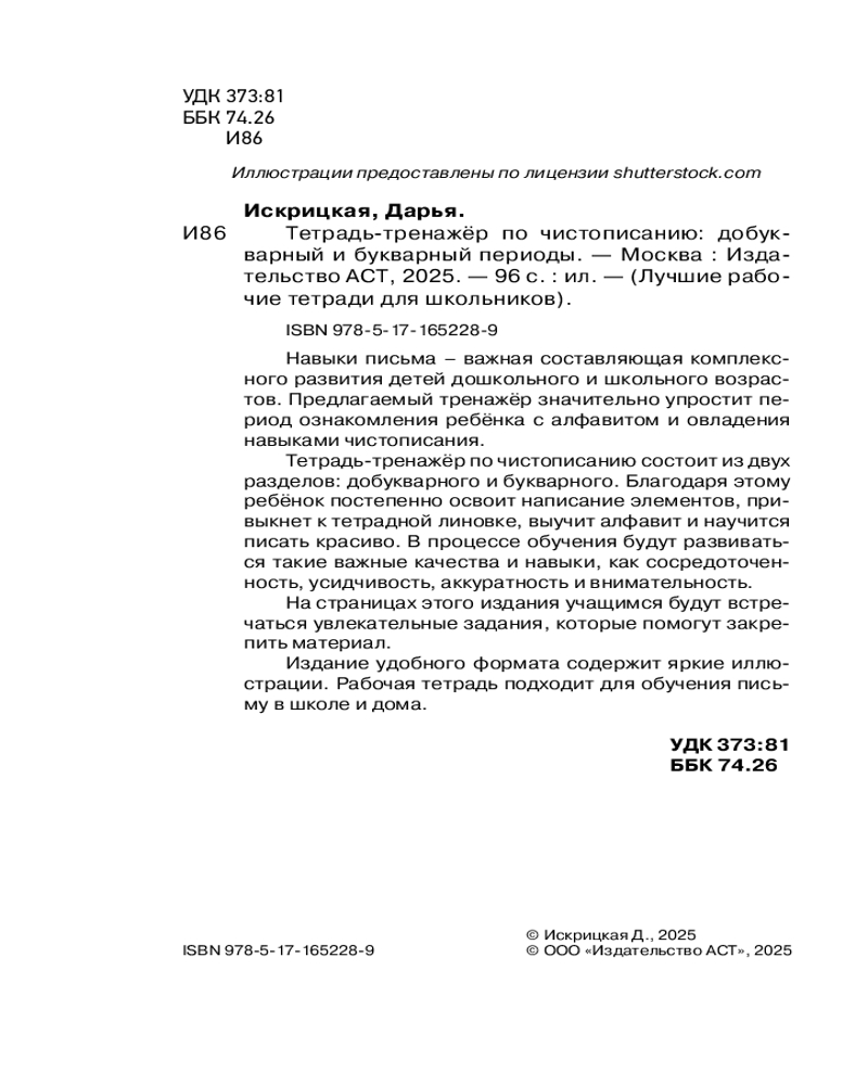 💳 Оплатить за товар можно при получении 🇰🇿 Есть бесплатная доставка по Казахстану от 1 дня 🎁 Копите бонусы с каждой покупки Серия: Лучшие рабочие тетради для школьников Навыки письма — важная составляющая комплексного развития детей дошкольного и школьного возрастов. Предлагаемый тренажёр значительно упростит период ознакомления ребёнка с алфавитом и овладения навыками чистописания. Тетрадь-тренажёр по чистописанию состоит из двух разделов: добукварного и букварного. Благодаря этому ребёнок постепенно освоит написание элементов, привыкнет к тетрадной линовке, выучит алфавит и научится писать красиво. В процессе обучения будут развиваться такие важные качества и навыки, как сосредоточенность, усидчивость, аккуратность и внимательность. На страницах этого издания учащимся будут встречаться увлекательные задания, которые помогут закрепить материал. Издание удобного формата содержит яркие иллюстрации. Рабочая тетрадь подходит для обучения письму в школе и дома. |