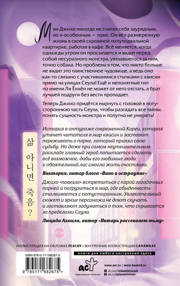 💳 Оплатить за товар можно при получении 🇰🇿 Есть бесплатная доставка по Казахстану от 1 дня 🎁 Копите бонусы с каждой покупки Серия: Книжный клуб Мирай Мин Джихо никогда не считал себя заурядным, но и особенным — тоже. Он вёл размеренную жизнь в своей скромной полуподвальной квартирке, работая в кафе. Всё меняется, когда однажды утром он просыпается и видит перед собой несуразного монстра, увязавшегося за ним, точно собака. Но проблема в том, что никто больше не видит это таинственное чудовище, а ведь оно как-то связано с участившимися стычками с квисин прямо на улицах Сеула! Ещё и непонятный тип по имени Ли Ёнхён не может от него отстать, а брат лучшей подруги без вести пропадает. Теперь Джихо придётся нырнуть с головой в потустороннюю часть Сеула, чтобы разгадать все тайны, понять сущность монстра и попутно не умереть! |