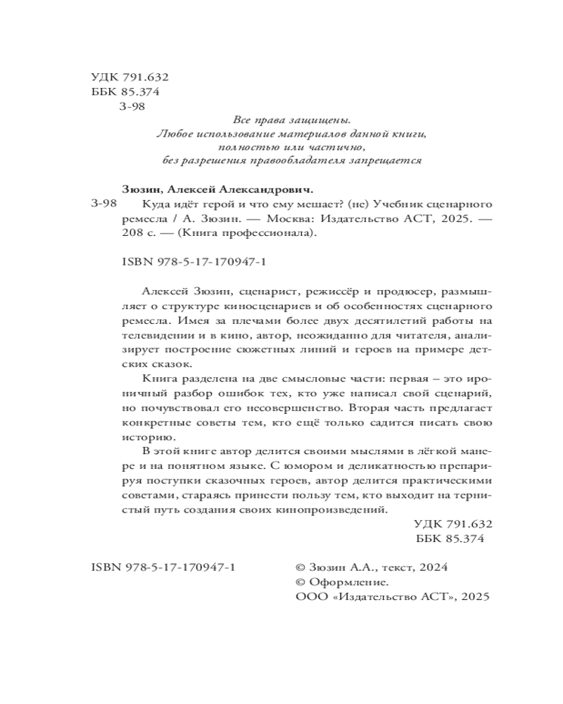 💳 Оплатить за товар можно при получении 🇰🇿 Есть бесплатная доставка по Казахстану от 1 дня 🎁 Копите бонусы с каждой покупки Серия: Книга профессионала Алексей Зюзин, сценарист, режиссёр и продюсер, размышляет о структуре киносценариев и об особенностях сценарного ремесла. Имея за плечами более двух десятилетий работы на телевидении и в кино, автор, неожиданно для читателя, анализирует построение сюжетных линий и героев на примере детских сказок. |