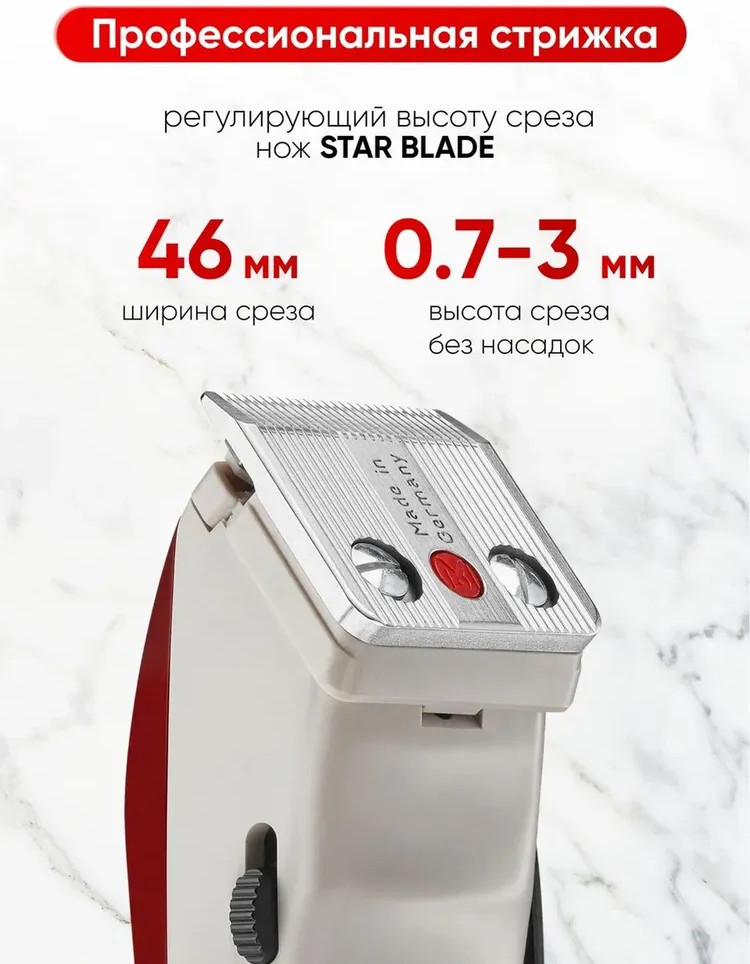 • высококачественные лезвия. Лезвия машинки изготовлены из нержавеющей стали, что обеспечивает долгий срок службы и высокую точность стрижки. Самозатачивающиеся ножи гарантируют постоянную остроту лезвий и эффективность работы;
