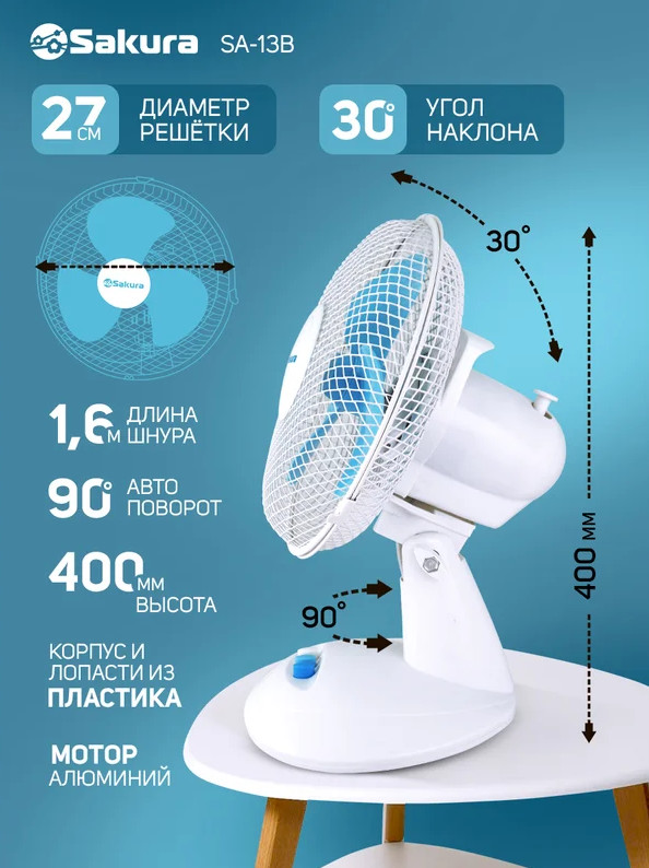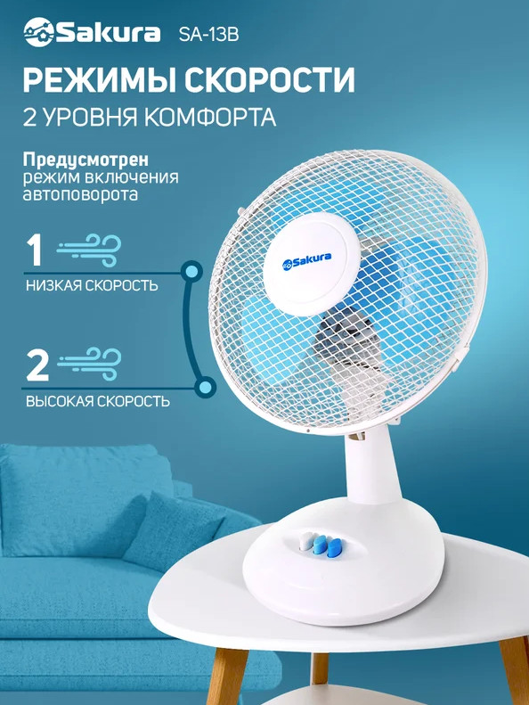 Настольный вентилятор Sakura SA-13B — незаменимый помощник в жаркие дни. Этот электрический прибор создан для обеспечения комфортного охлаждения воздуха в вашем доме или на рабочем месте. Благодаря своей компактности и удобству использования, он легко поместится на любом столе или столике.