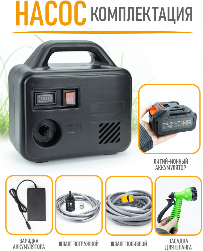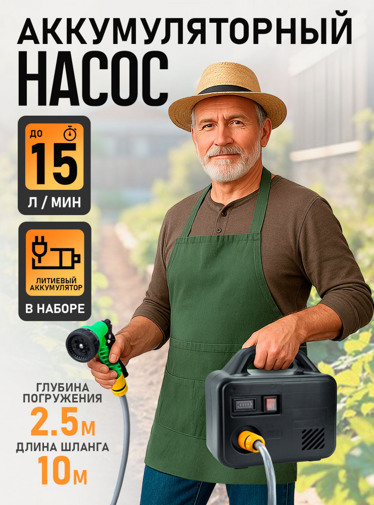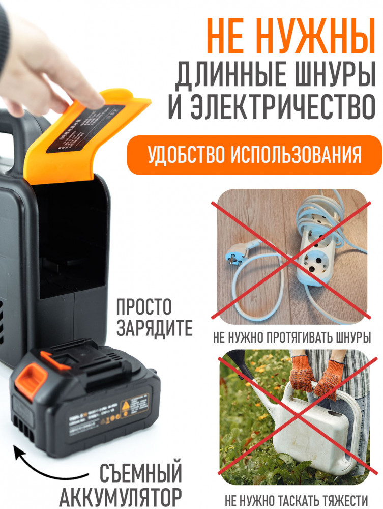 В данный момент этот товар отсутствует в продаже. Возможно, у нас найдется аналогичный или похожий товар здесь. Аккумуляторный водяной насос — современное, удобное и многофункциональное устройство, предназначенное для полива сада, мытья автомобиля, очистки дорожек и любых других хозяйственных нужд. Этот насос сочетает в себе высокую производительность, мобильность и простоту использования, что делает его отличным выбором как для дома, так и для дачи.