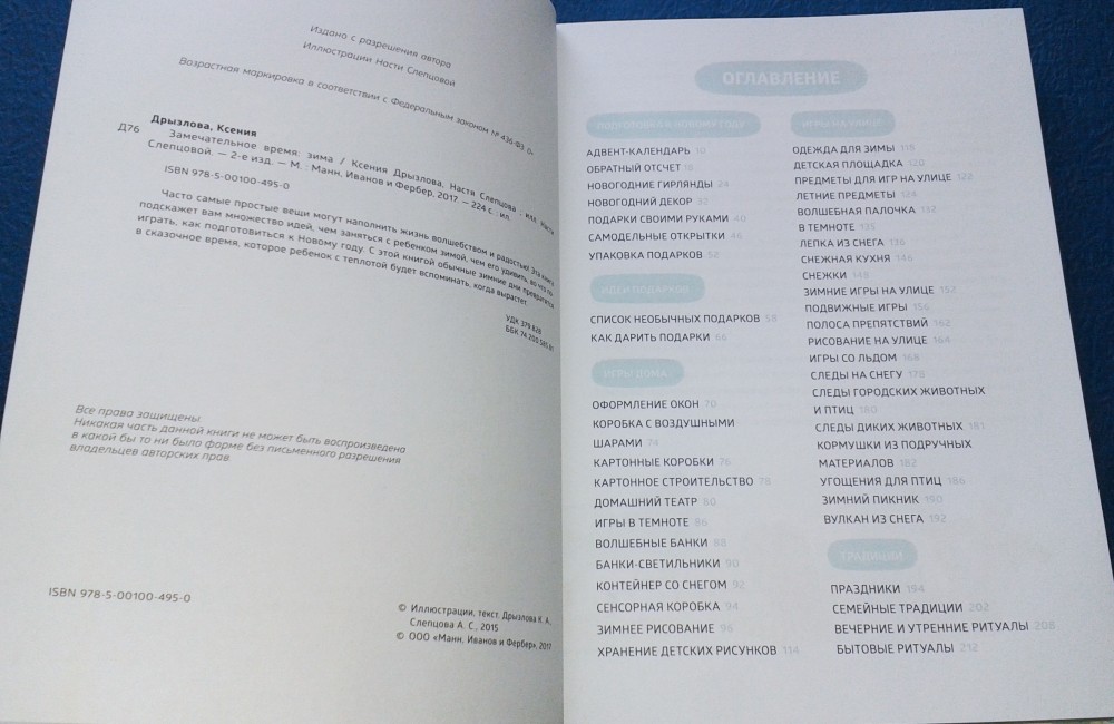 Давно книга "Замечательное время. Зима" была в моих отложенных товарах, и, наконец-то, она у меня) Очень полезное издание, со множеством идей, как замечательно провести время со своими детьми долгой холодной зимой. Качество печати - выше всяких похвал. Листы - плотный офсет, есть каптал и ляссе. Чувствуется авторский стиль в иллюстрациях. Основными цветами выбраны пять - белый, бледно-голубой, бледно-желтый, серый и светло-коричневый. Однозначно, эта зима будет у нас очень интересной! Флипу спасибо за скидку!