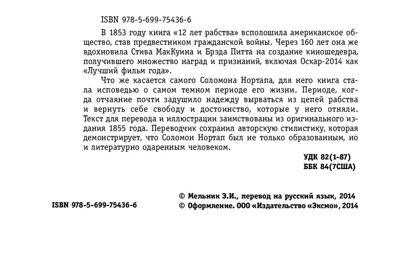 12 лет рабства. Реальная история предательства, похищения и силы духаВ данный момент этот товар отсутствует в продаже. Возможно, у нас найдется аналогичный или похожий товар здесь. Серия: Лучшее в психологии. Флипбуки В 1853 году книга «12 лет рабства» всполошила американское общество, став предвестником гражданской войны. Через 160 лет она же вдохновила Стива МакКуина и Брэда Питта на создание киношедевра, получившего множество наград и признаний, включая Оскар-2014 как «Лучший фильм года». |