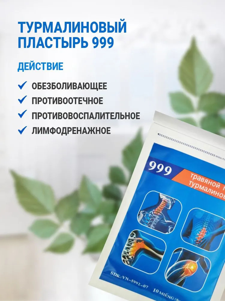 Эффективное обезболивающее, противоотечное и противовоспалительное средство при широком спектре заболеваний опорно-двигательного аппарата. Способствует быстрому восстановлению здоровья после травм, ушибов, растяжений мышц и связок. В основу разработки пластыря 999 положено уникальное по своим терапевтическим свойствам действие турмалина — целебного природного минерала. Средство обеспечивает полноценную физиотерапию в домашних условиях. Обладает обширным противоотечным, противовоспалительным, посттравматическим и лимфодренажным действием. Уменьшает отёчность и боль, возвращает подвижность суставов, улучшает обменные процессы в хрящевой ткани, содействует расслаблению защемлённых мышц и устраняет скованность при движении.