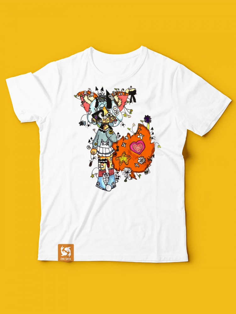 | Молодой бренд детской и подростковой одежды с авторскими принтами по рисункам 10-летней художницы. В её работах сплетаются комиксы, культура аниме, поп-арт, восточные мифы, коллажная техника. Главные герои творчества Евы — фантастические девочки, которые обращаются в лисиц, мотыльков, грибы. Они своенравны и талантливы, каждая обладает уникальными характеристиками, которые подробно описываются автором. |