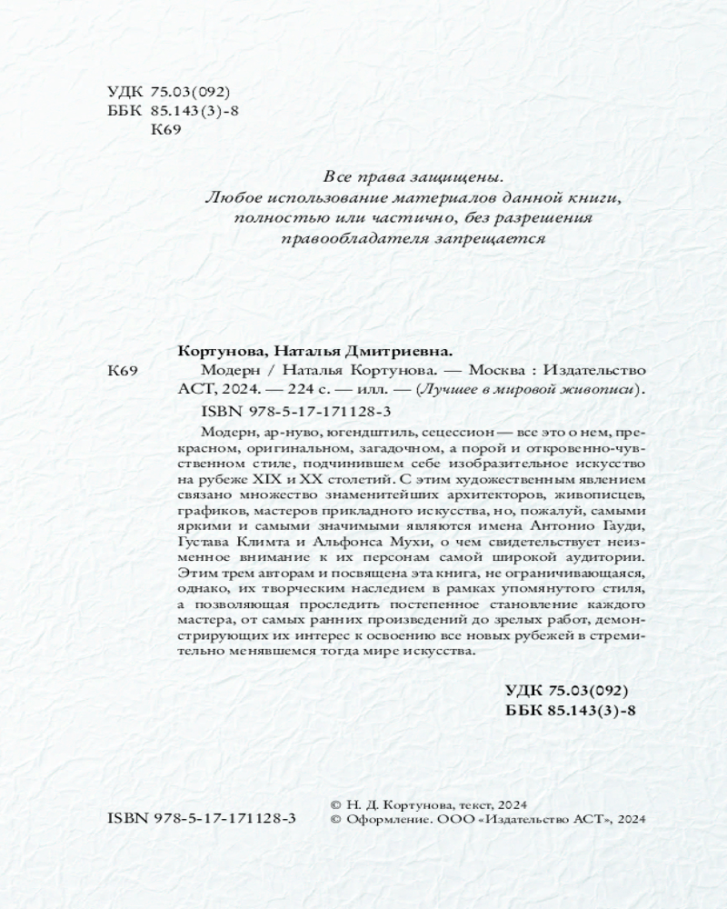 💳 Оплатить за товар можно при получении 🇰🇿 Есть бесплатная доставка по Казахстану от 1 дня 🎁 Копите бонусы с каждой покупки Серия: Лучшее в мировой живописи Модерн, ар-нуво, югендштиль, сецессион — всё это о нем, прекрасном, оригинальном, загадочном, а порой и откровенно-чувственном стиле, подчинившем себе изобразительное искусство на рубеже XIX и XX столетий. С этим художественным явлением связано множество знаменитейших архитекторов, живописцев, графиков, мастеров прикладного искусства, но, пожалуй, самыми яркими и самыми значимыми являются имена Антонио Гауди, Густава Климта и Альфонса Мухи, о чем свидетельствует неизменное внимание к их персонам самой широкой аудитории. Этим трем авторам и посвящена эта книга, не ограничивающаяся, однако, их творческим наследием в рамках упомянутого стиля, а позволяющая проследить постепенное становление каждого мастера, от самых ранних произведений до зрелых работ, демонстрирующих их интерес к освоению всё новых рубежей в стремительно менявшемся тогда мире искусства. |