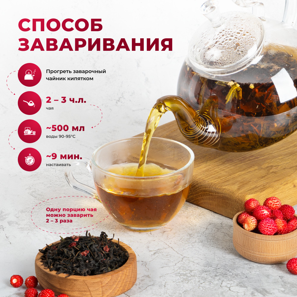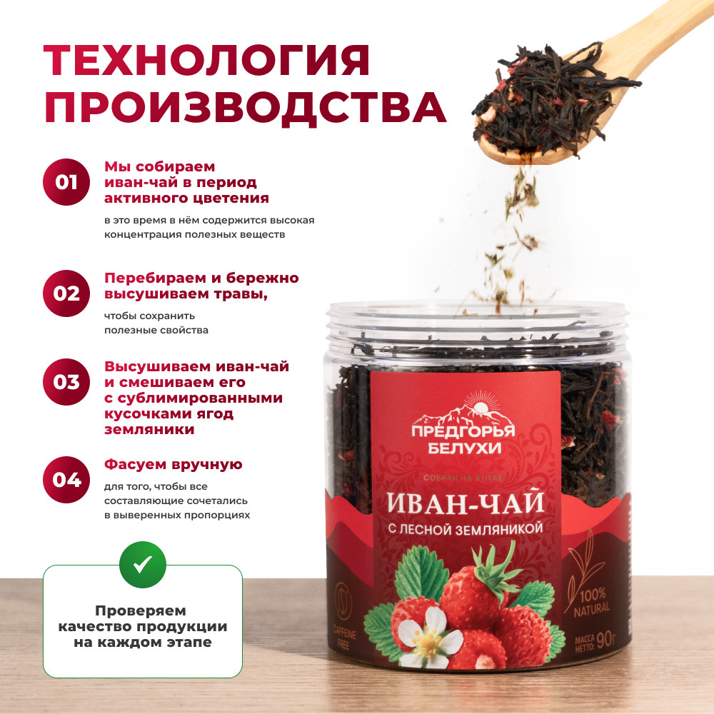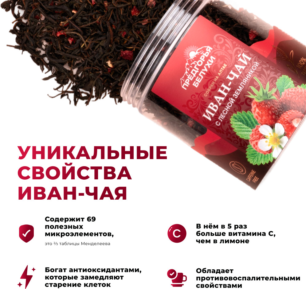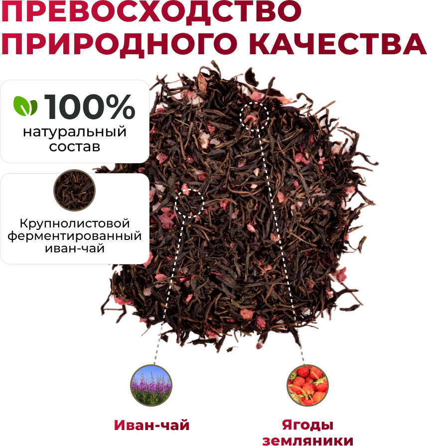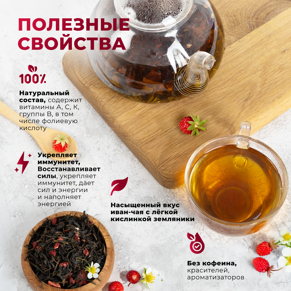 Насыщенный и приятный напиток, наполненный природной энергией и нежностью. Сбалансированное сочетание ароматного иван-чая с яркой и сладкой свежестью лесной земляники создает уникальный букетов ахроматов и вкусов. Иван-чай с лесной земляникой содержит антиоксиданты, которые помогают защитить организм. Лесная земляника содержит витамин C и другие питательные вещества, которые способствуют поддержке иммунной системы. Аромат — сладкий, ягодный, цвет — тёмно-золотистый, вкус — сладкий с травяными и ягодными нотками. Эффект: дарит ощущение бодрости и придаёт энергии для активного дня.