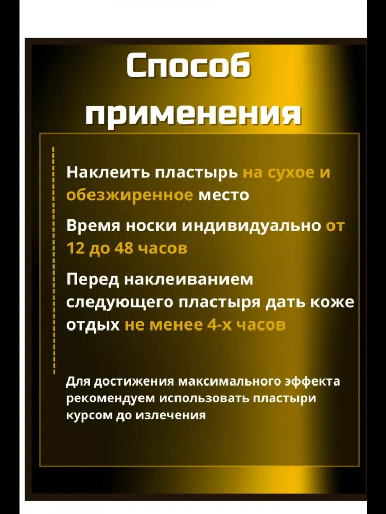 Способ применения: наложить пластырь на чистую и сухую кожу, продержать на проблемном месте 10-12 часов, после желательно снять на 2-3 часа и можно повторить процедуру. Для достижения максимального эффекта рекомендуется пластырь носить 2-3 суток.