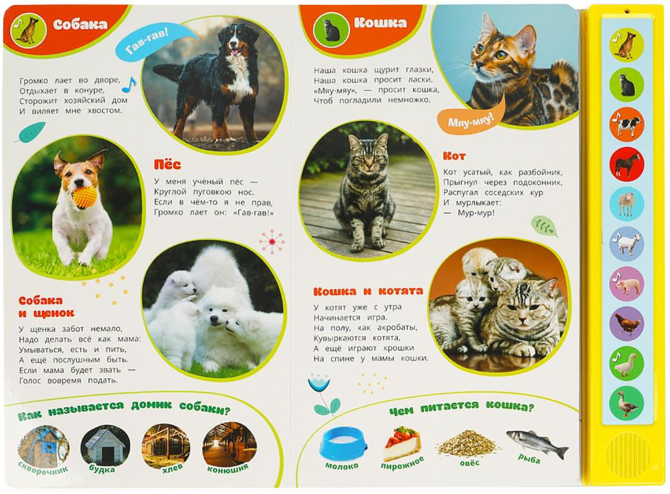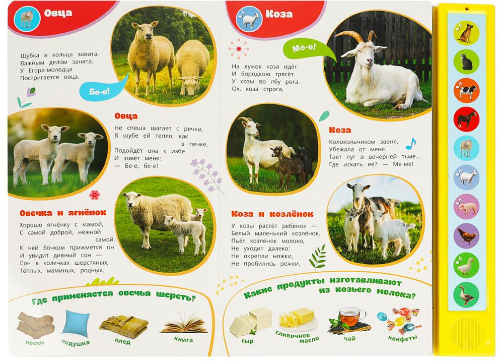 Эта книга — настоящая говорящая энциклопедия, которая познакомит малыша с животными и их голосами. Ребенок с удовольствием будет рассматривать картинки, слушать стихи про обитателей фермы и домашних питомцев, отвечать на занимательные вопросы и нажимать на звуковые кнопки. Одно нажатие на кнопку — включится звук, второе нажатие — выключится. Книжка сделана из плотного картона, поэтому родители могут не опасаться за её сохранность.