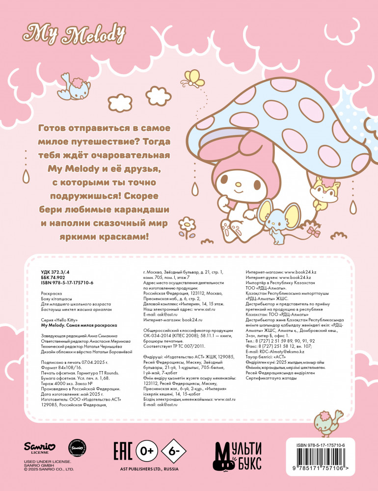 💳 Оплатить за товар можно при получении 🇰🇿 Есть бесплатная доставка по Казахстану от 1 дня 🎁 Копите бонусы с каждой покупки Серия: Hello Kitty Готов отправиться в самое милое путешествие? Тогда тебя ждёт очаровательная My Melody и её друзья, с которыми ты точно подружишься! Скорее бери любимые карандаши и наполни сказочный мир яркими красками! |