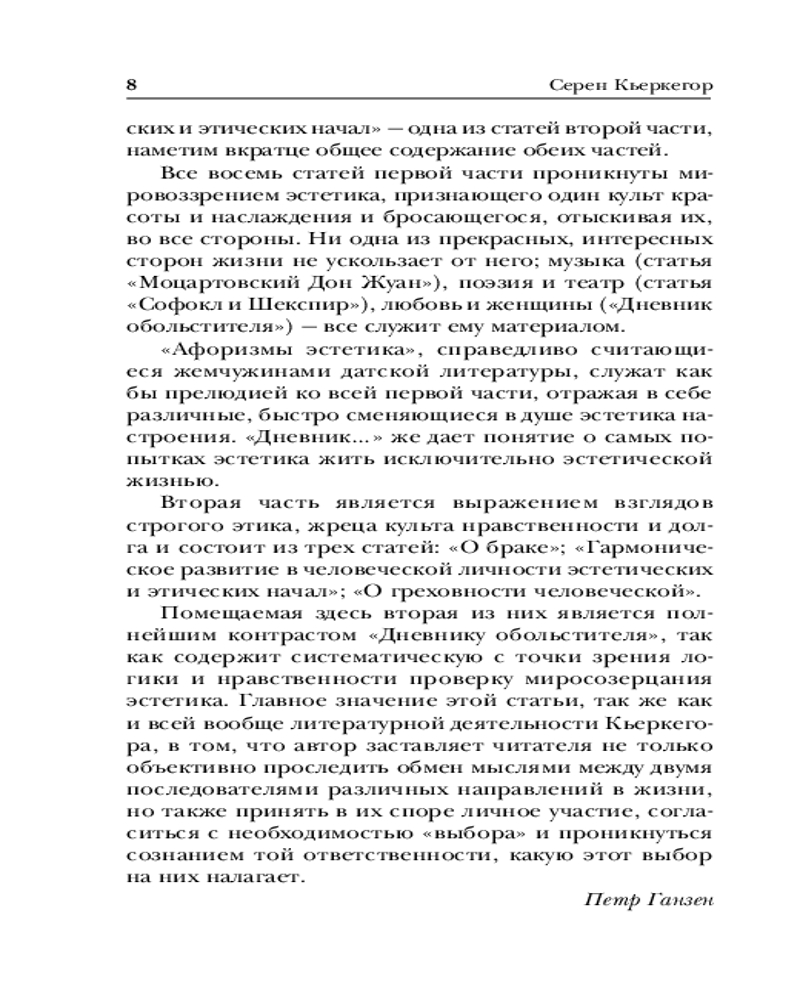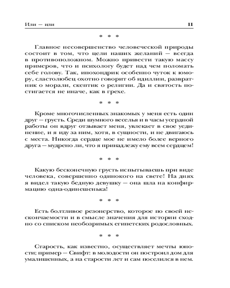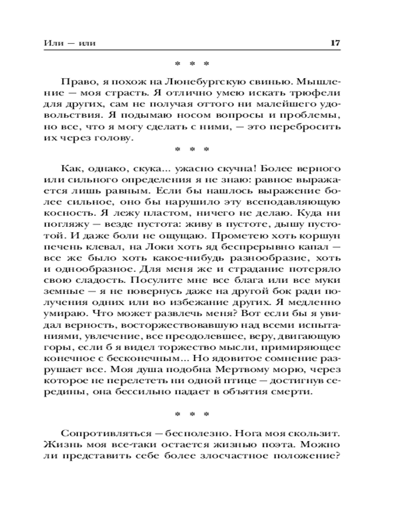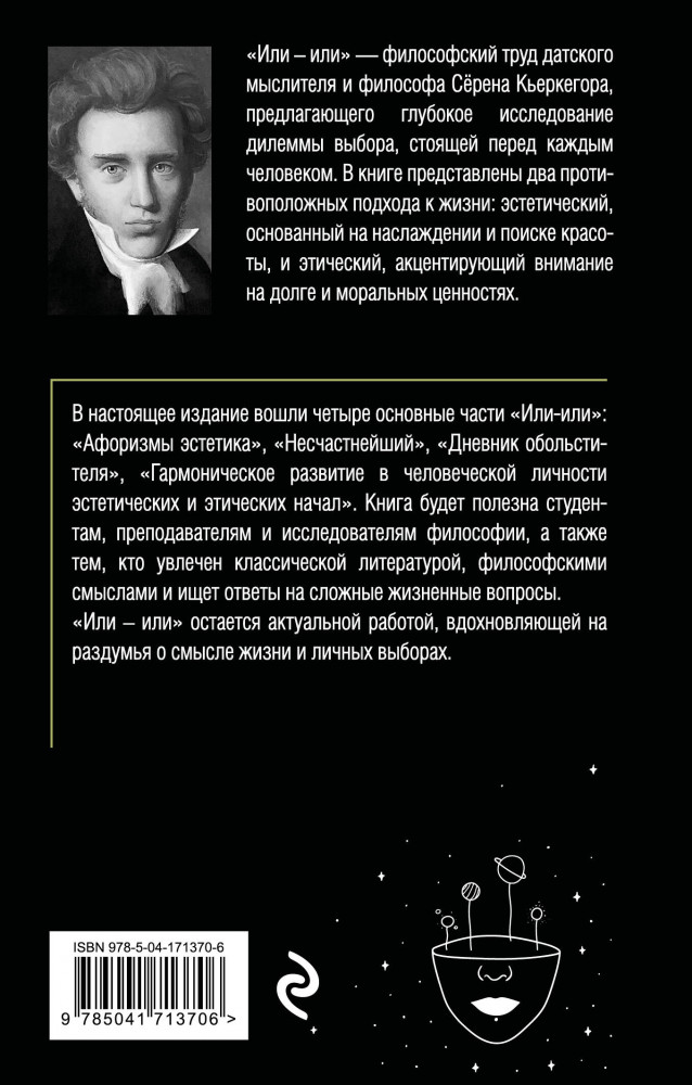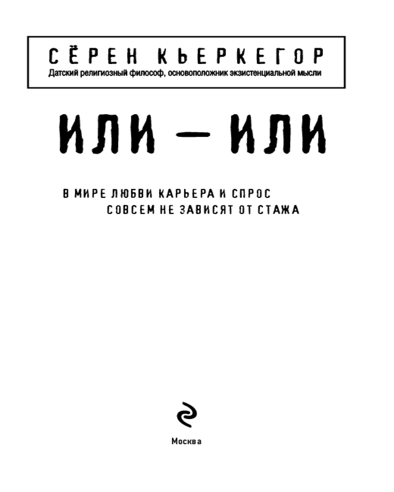 Серия: Философия в кармане (покет) Трактат «Или — или» Сёрена Кьеркегора заставляет задуматься о самом сокровенном — о выборе между эстетической погоней за удовольствиями и этическими обязательствами перед миром и самим собой. Автор мастерски показывает читателю два мира: мир эстетика, живущего сегодняшним днем, и мир этика, ищущего глубинный смысл в значимых связях и ответственности. Философские очерки, парадоксы жизни и даже дневник обольстителя — каждая часть предоставляет читателю уникальную возможность взглянуть на жизнь с разных сторон. Это не просто книга — это приглашение к самопознанию и размышлению о выборе, который делает нас теми, кто мы есть. Откройте для себя «Или — или» и найдите свое истинное направление в мире, наполненном противоречиями. |