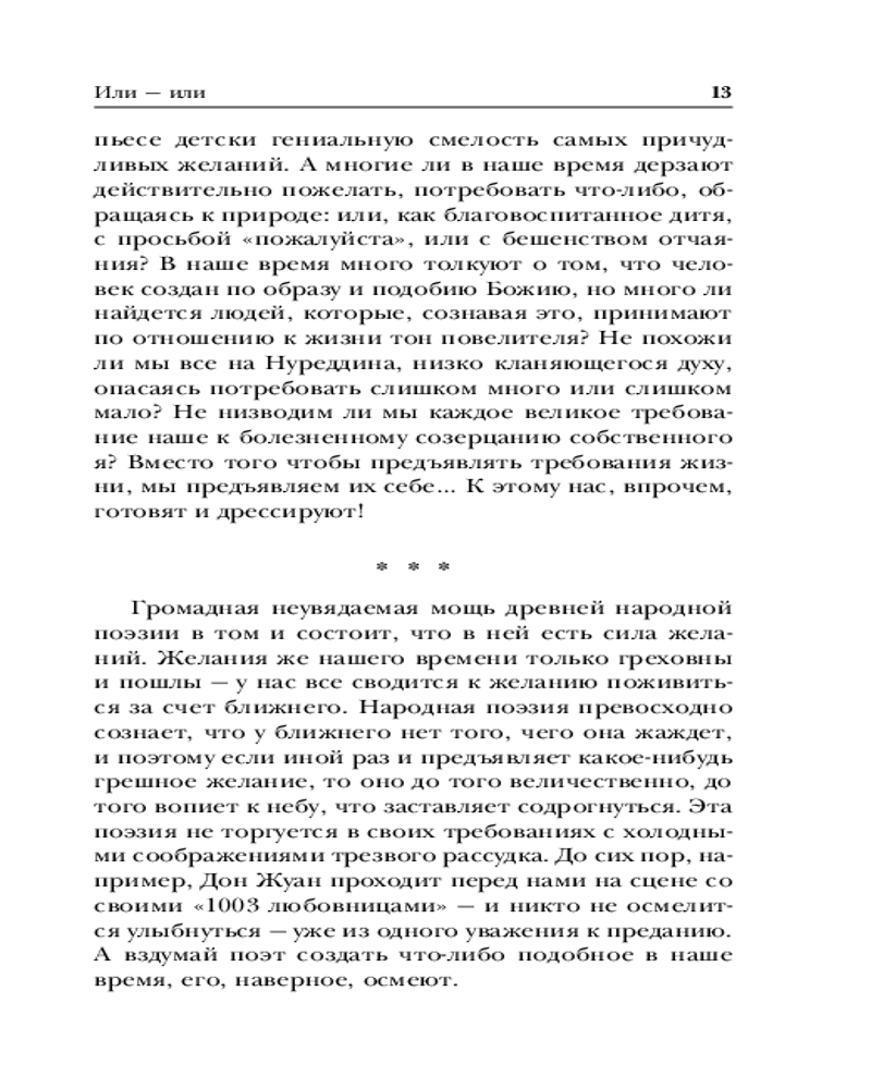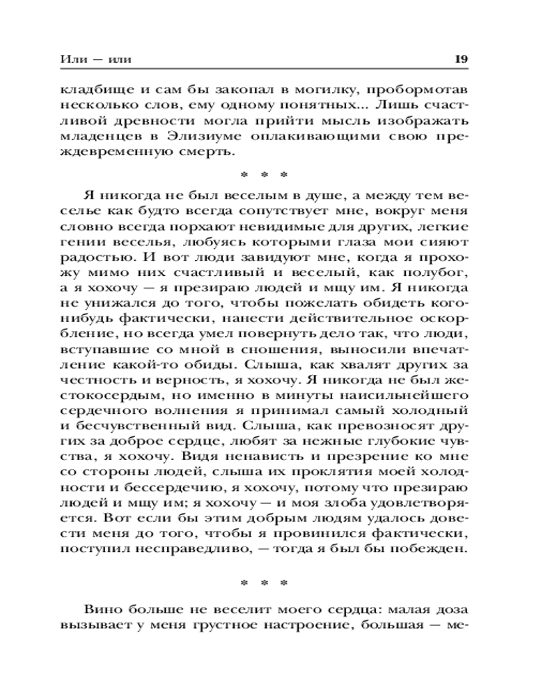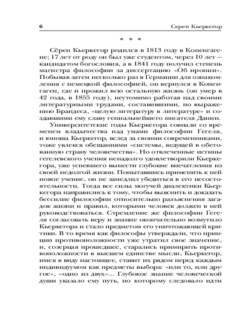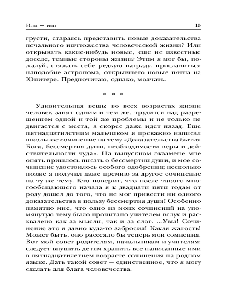 Серия: Философия в кармане (покет) Трактат «Или — или» Сёрена Кьеркегора заставляет задуматься о самом сокровенном — о выборе между эстетической погоней за удовольствиями и этическими обязательствами перед миром и самим собой. Автор мастерски показывает читателю два мира: мир эстетика, живущего сегодняшним днем, и мир этика, ищущего глубинный смысл в значимых связях и ответственности. Философские очерки, парадоксы жизни и даже дневник обольстителя — каждая часть предоставляет читателю уникальную возможность взглянуть на жизнь с разных сторон. Это не просто книга — это приглашение к самопознанию и размышлению о выборе, который делает нас теми, кто мы есть. Откройте для себя «Или — или» и найдите свое истинное направление в мире, наполненном противоречиями. |