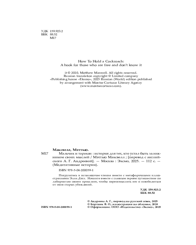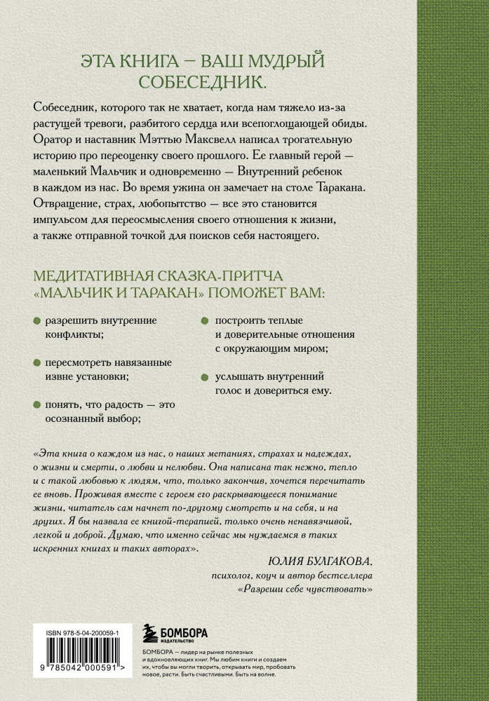 💳 Оплатить за товар можно при получении 🇰🇿 Есть бесплатная доставка по Казахстану 🎁 Копите бонусы с каждой покупки Серия: Медитативные истории Эта книга — ваш мудрый собеседник. Собеседник, которого так не хватает, когда нам тяжело из-за растущей тревоги, разбитого сердца или всепоглощающей обиды. Оратор и наставник Мэттью Максвелл написал трогательную историю про переоценку своего прошлого. Её главный герой — маленький мальчик и одновременно — внутренний ребёнок в каждом из нас. Во время ужина он замечает на столе таракана. Отвращение, страх, любопытство — всё это становится импульсом для переосмысления своего отношения к жизни, а также отправной точкой для поисков себя настоящего. |