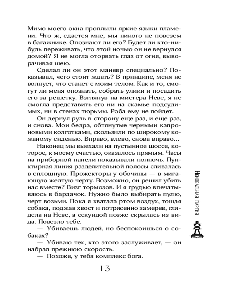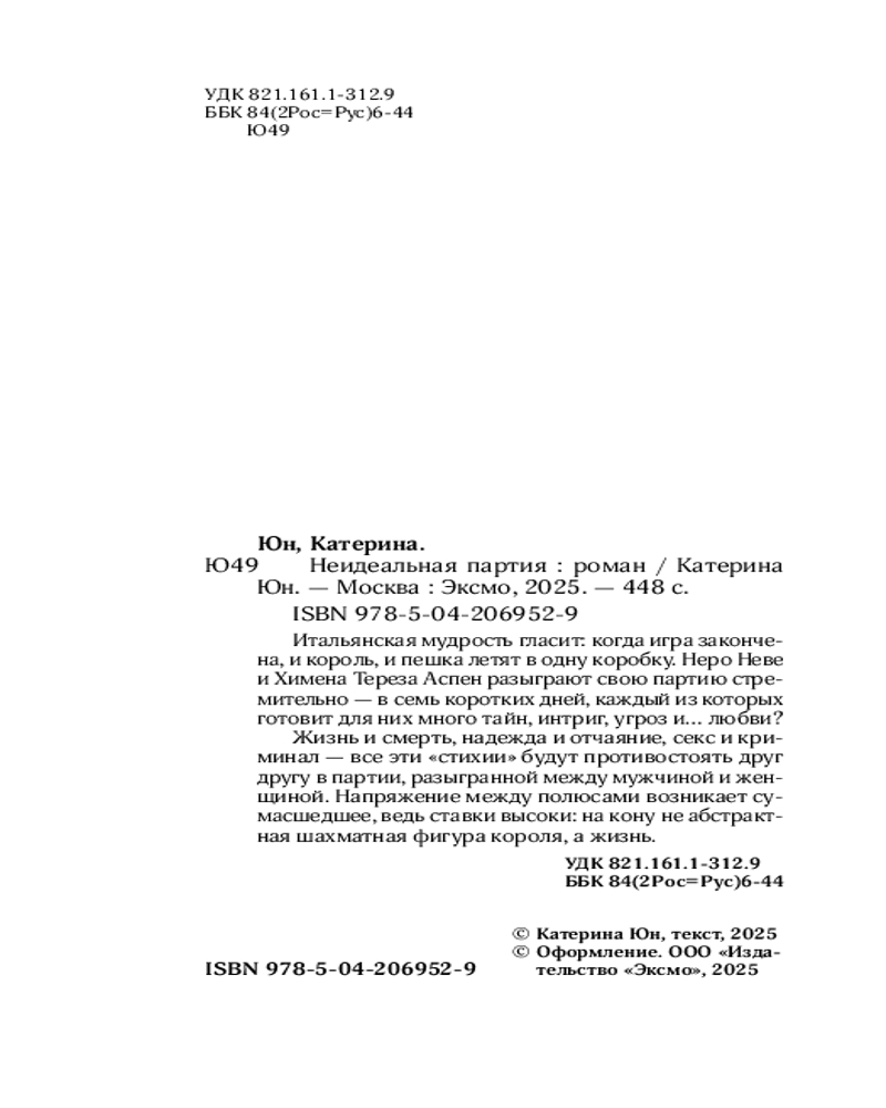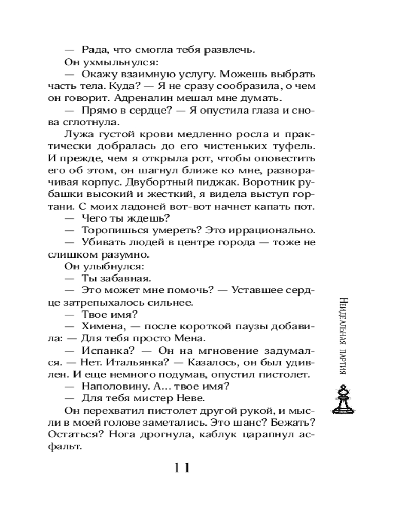 💳 Оплатить за товар можно при получении 🇰🇿 Есть бесплатная доставка по Казахстану от 1 дня 🎁 Копите бонусы с каждой покупки Серия: Вне законов любви. Темная романтика Итальянская мудрость гласит: когда игра закончена, и король, и пешка летят в одну коробку. Неро Неве и Химена Тереза Аспен разыграют свою партию стремительно — в семь коротких дней, каждый из которых готовит для них много тайн, интриг, угроз и... любви? Жизнь и смерть, эрос и танатос, секс и криминал — все эти «стихии» будут противостоять друг другу в партии, разыгранной между мужчиной и женщиной. Напряжение между полюсами возникает сумасшедшее, ведь ставки высоки: на кону не абстрактная шахматная фигура короля, а жизнь. |
