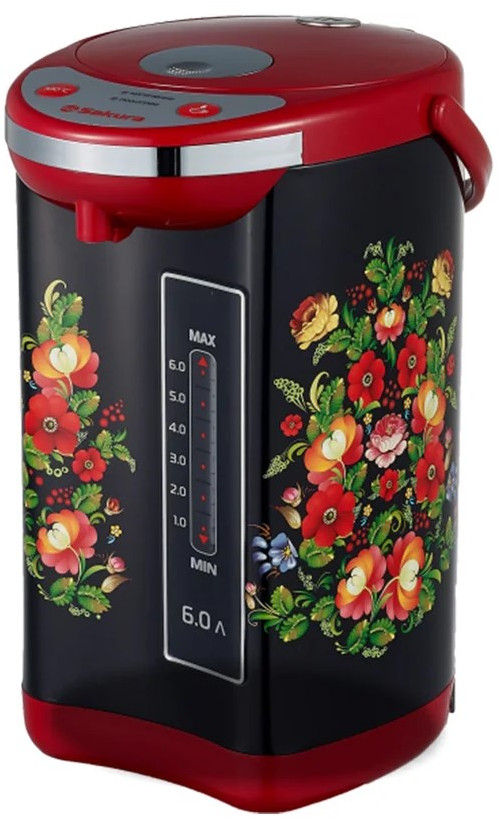 Термопот Sakura 6,0 л SA-316BRF предназначен для дома или офиса. Используется для нагрева воды и удержания ее температуры в течение длительного времени, что экономит время и силы на многоразовый разогрев чайника. Имеет объем 6 литров, поэтому отличается вместительностью, за счет чего подходит для нескольких человек. Термопот оснащен ручкой, поэтому удобен при переноске, что позволяет брать его с собой на пикник или на дачу.