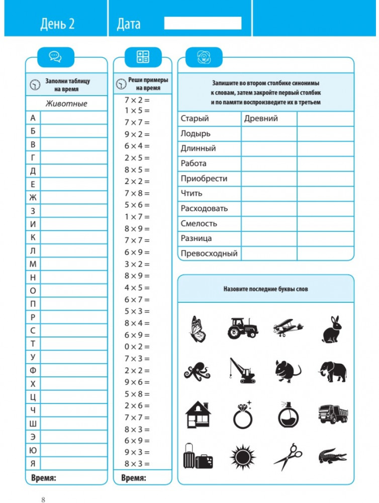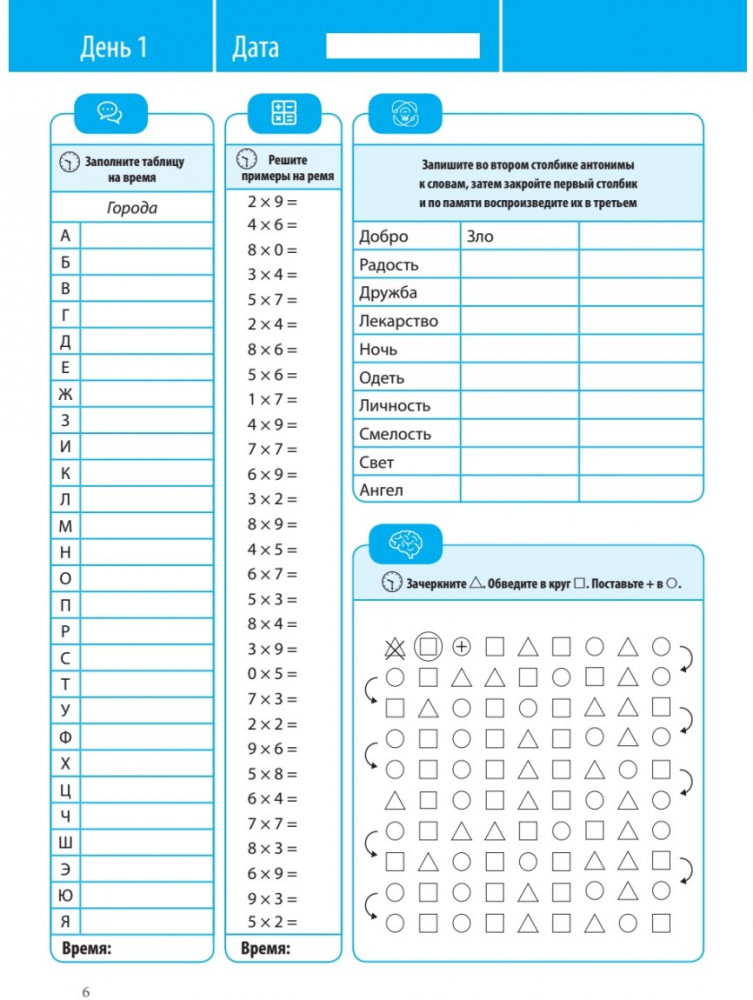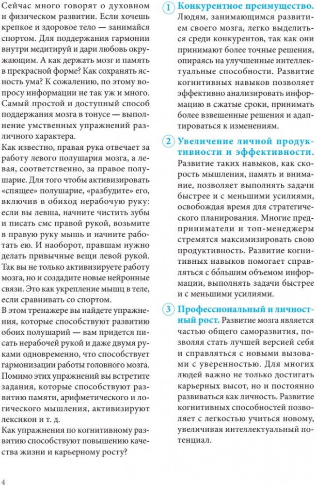 💳 Оплатить за товар можно при получении 🇰🇿 Есть бесплатная доставка по Казахстану от 1 дня 🎁 Копите бонусы с каждой покупки Книга-тренажер разработана на основе авторских методик Елены Доки (Бруевой), руководителя «Центра скорочтения и развития интеллекта Doka-school». В данном тренажере представлен ряд упражнений на каждый день, который позволит развить скорость мышления, память, логическое мышление, арифметическое мышления, активизируют и расширят лексикон. Все эти навыки помогут повысить работоспособность и улучшить качество жизни. |