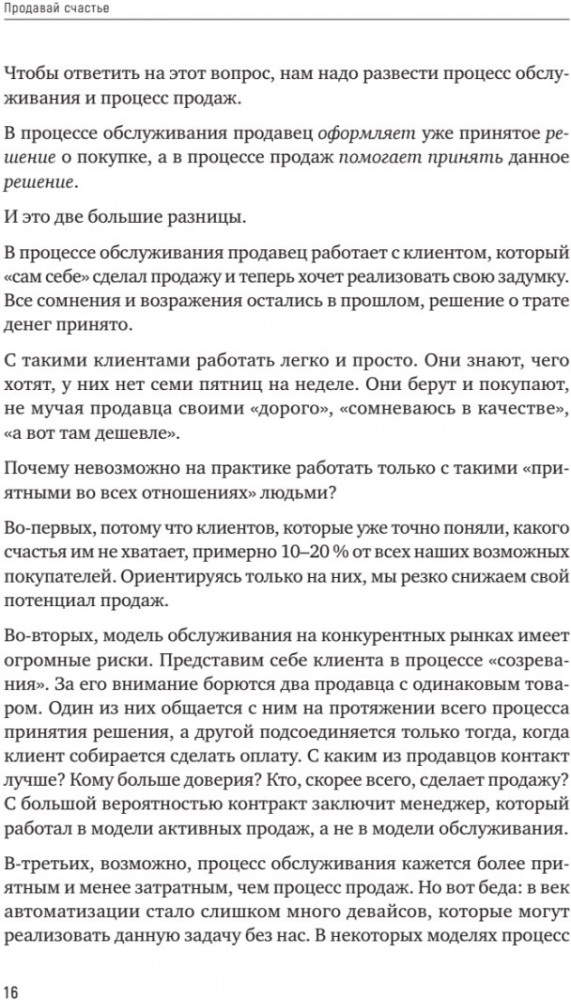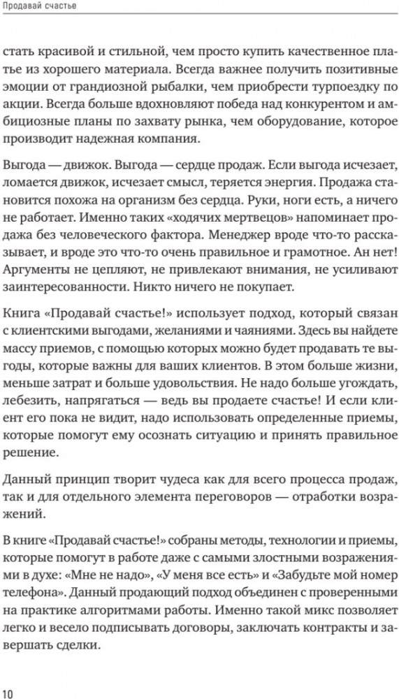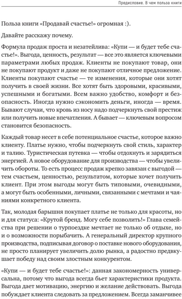 Автор использует подход, связанный с клиентскими выгодами, желаниями и чаяниями. Вы найдете массу приемов, благодаря которым можно будет продавать те выгоды, которые важны для ваших клиентов. В этом больше жизни, меньше затрат и больше удовольствия. Не надо всячески извиваться, подхалимничать и напрягаться. Ведь вы продаете счастье. И если пока клиент его не видит, вы просто используете те шаги, которые помогут увидеть, осознать и принять правильное решение.