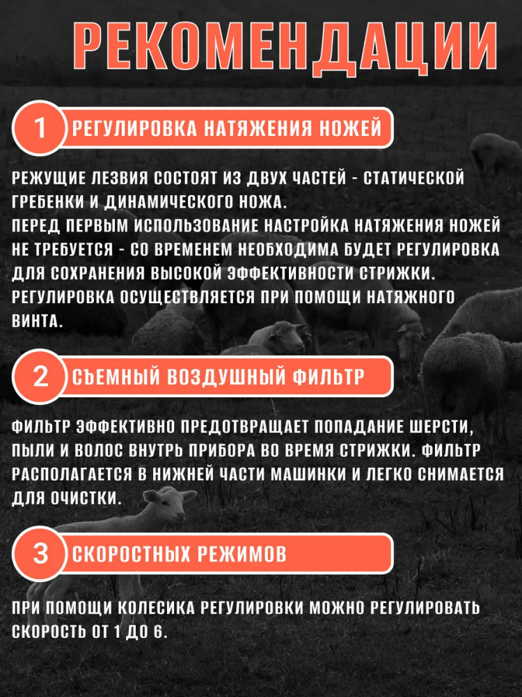 Grodo Машинка для стрижки овец Berlin 2В данный момент этот товар отсутствует в продаже. Возможно, у нас найдется аналогичный или похожий товар здесь. Профессиональная машинка для стрижки овец, баранов и других животных, чтобы получить быстро качественное руно. Смазывайте при работе ножевой блок маслом — это позволит продлить срок службы ножей и машинки. Винт в верхней части стригущей головки регулирует силу прижима ножей к месту стрижки на теле животного. Машинка для стрижки овец, баранов, верблюдов имеет 6 скоростей — удобно и для новичка, и для профессионала. Воздушное охлаждение защищает двигатель от перегрева при интенсивной стрижке поголовья овец или баранов. Воздушный фильтр защищен сеткой — срезанная шерсть не попадёт внутрь корпуса! Фильтр можно снять для очистки. Рукоятка машинки для стрижки животных сделана из фактурного прорезиненного пластика — не выскальзывает при работе из рук. Длина шнура позволяет иметь розетку на расстоянии до 4,5 м и работать в любого ракурса и захвата. |