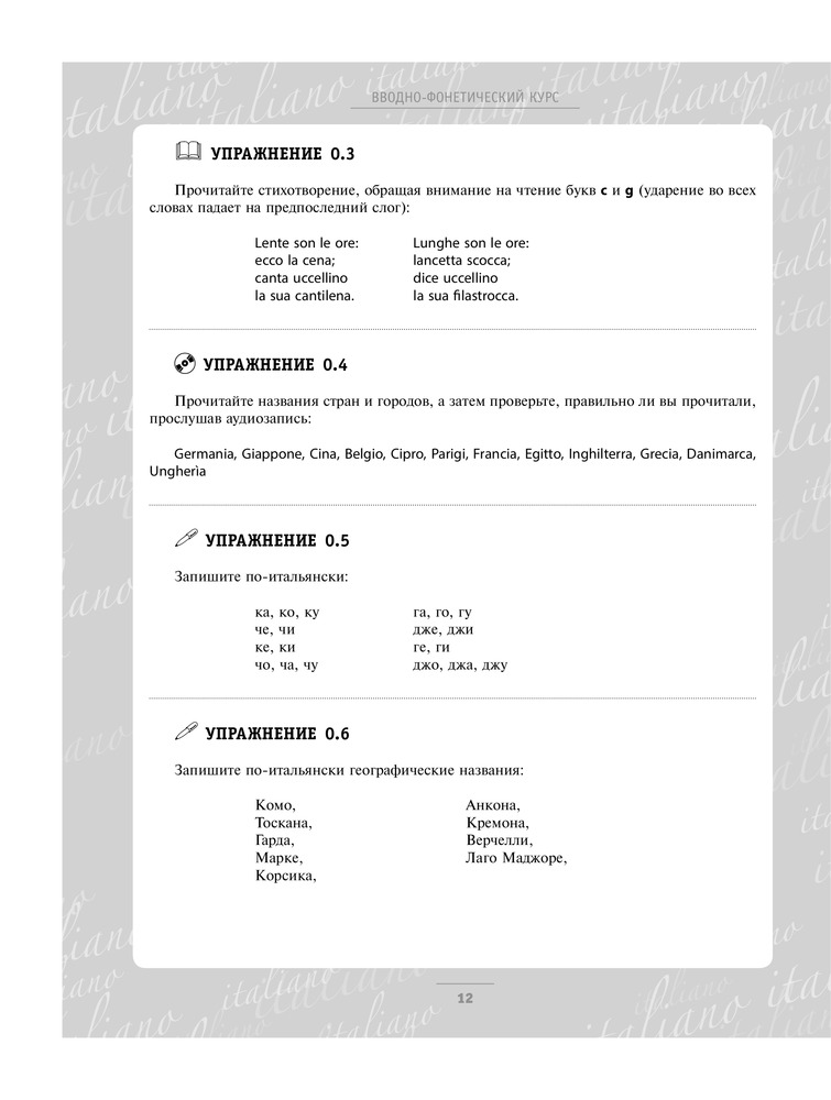 Итальянский язык для начинающих (+CD)Наталья Александровна Рыжак, Елена Александровна Рыжак В данный момент этот товар отсутствует в продаже. Возможно, у нас найдется аналогичный или похожий товар здесь. Серия: Самоучитель нового поколения Самоучитель рассчитан на самую широкую аудиторию читателей и прежде всего на тех, кто желает получить в короткий срок качественные базовые знания итальянской грамматики и навыки устной и письменной речи. Курс состоит из 20 уроков, построенных по принципу от простого к сложному, и сопровождается CD-приложением, содержащим материалы, начитанные дикторами – носителями языка. Книга также содержит цветную вклейку с красочными страноведческими материалами, ключи к упражнениям и итальянско-русский словарь. Идеально подходит для самостоятельных занятий, а также для занятий с преподавателем. |