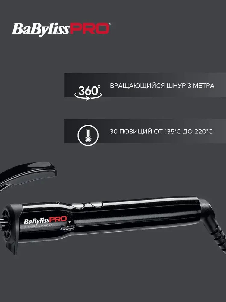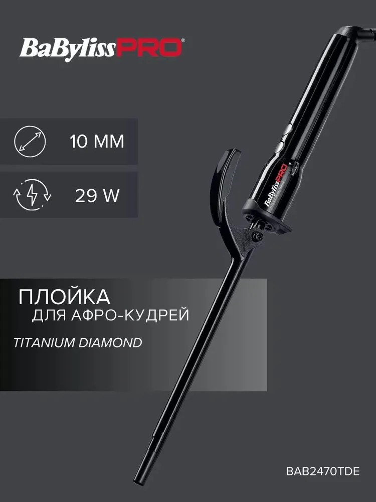 Плойка для афро-кудрей BaByliss PRO 10 мм с 30 температурными режимами — самая тонкая плойка для завивки волос. Диаметр плойки составляет всего 10 мм, позволяя создавать на волосах невероятные кудри. При этом, увеличенная до 19 см рабочая поверхность плойки позволяет быстро выполнить завивку даже на длинных волосах. На 60% больше поверхности и нагрева для завивки! А максимальная температура в 220°С справится с завивкой волос любого типа. Покрытие Titanium-Diamond стойкое к механическим и химическим повреждениям, может использоваться с любыми химическими веществами при любых процедурах.