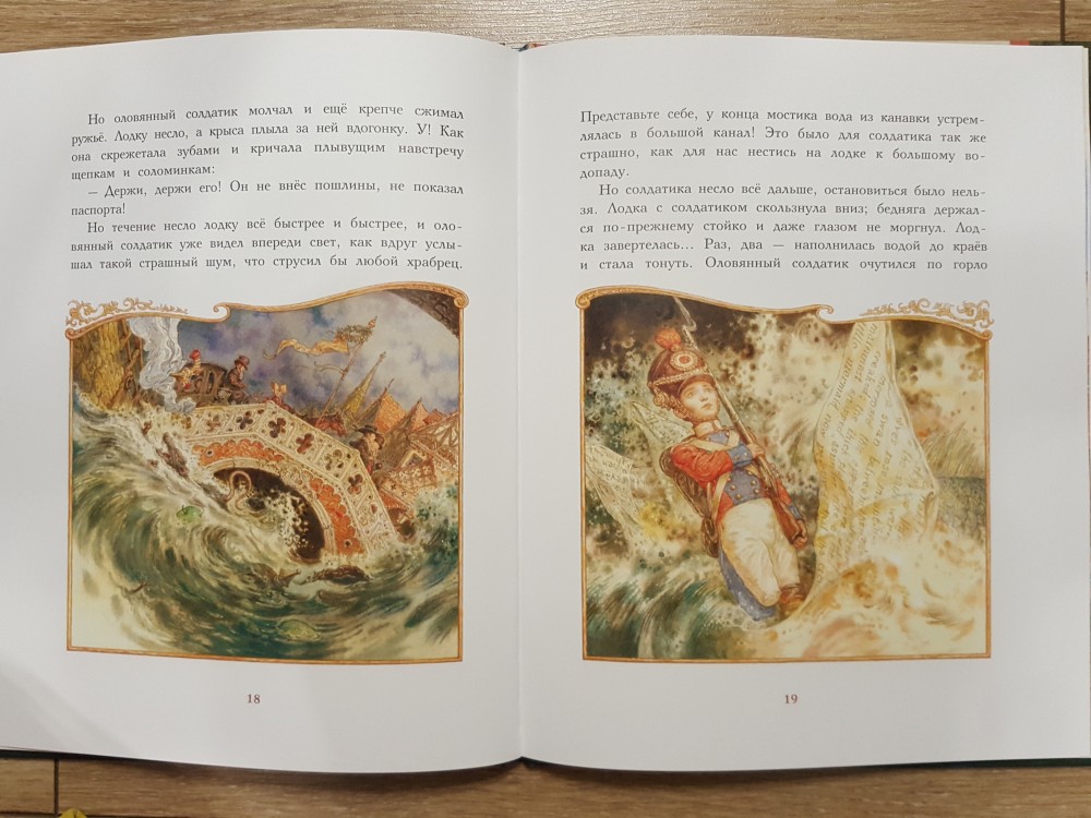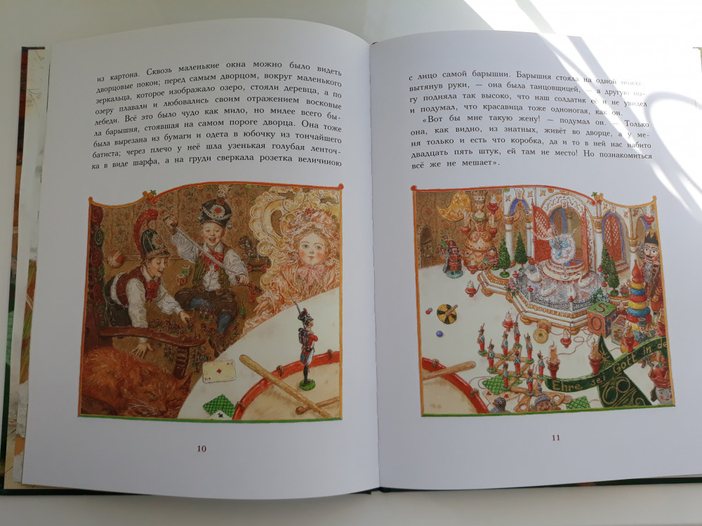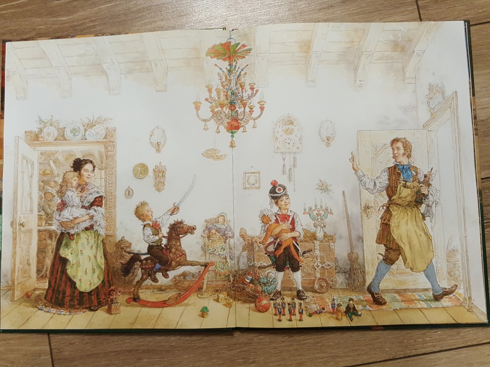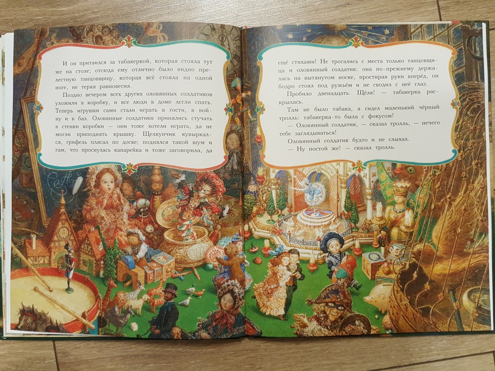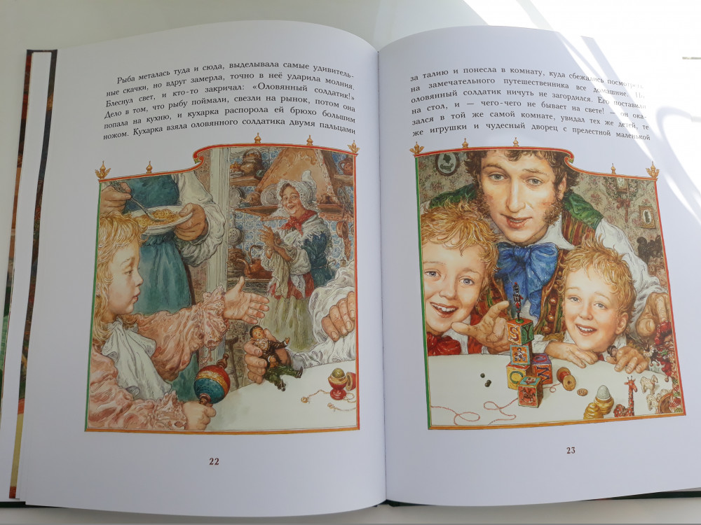 Отличная книга! Твердая лакированная обложка, большой формат, плотные мелованные страницы, любимая с детства сказка! Чудесные иллюстрации Антона Ломаева! Я не считала себя поклонницей Ломаева, но книги с его иллюстрациями в соей библиотеке только множатся! А вы заметили, что в этой книге он изобразил самого себя, свою жену, двух сыновей и дочурку "в перспективе"? А вы заметили на форзацах, как будто вырезано на деревянных балках "Лорета + Антон"?
