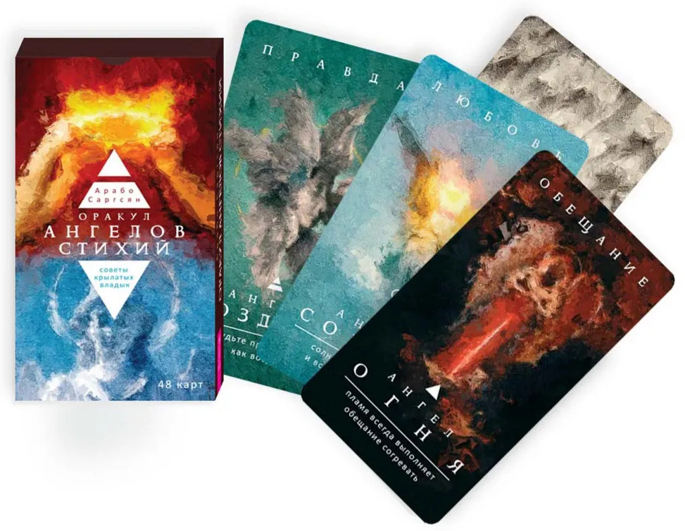 В новом оракуле Арабо Саргсяна представлены 48 стихийных ангелов, таких же разных, как сама природа: от прекрасных созданий с крыльями до абстрактных форм, в которых чувствуется мощь сверхъестественных существ. Они готовы делиться своими советами и мудростью, помогать и направлять на жизненном пути. Ангелы не добры и не злы, их функция — сохранять порядок вещей. Даже разрушительные явления, такие как землетрясение, ураган или смерч, в колоде несут позитивный ангельский совет, который, несмотря ни на что, обещает, что все будет хорошо.