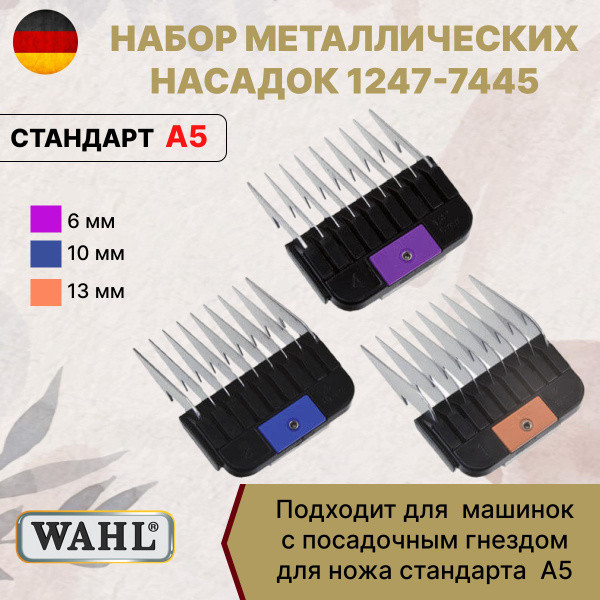 В данный момент этот товар отсутствует в продаже. Возможно, у нас найдется аналогичный или похожий товар здесь. Комплект металлических насадок Wahl Stainless Steel Snap-On Attachment Comb Set 1247-7445 разработан для парикмахерских или грумерских машинок с ножевыми блоками типа А5. Зубцы гребней сделаны из устойчивой к коррозии стали. Насадки крепятся на нож защелкивающимся пружинным механизмом Secure Fit и не соскакивают во время работы. Набор насадок применяют для изменения длины стрижки на три уровня: 6, 10 или 13 мм.