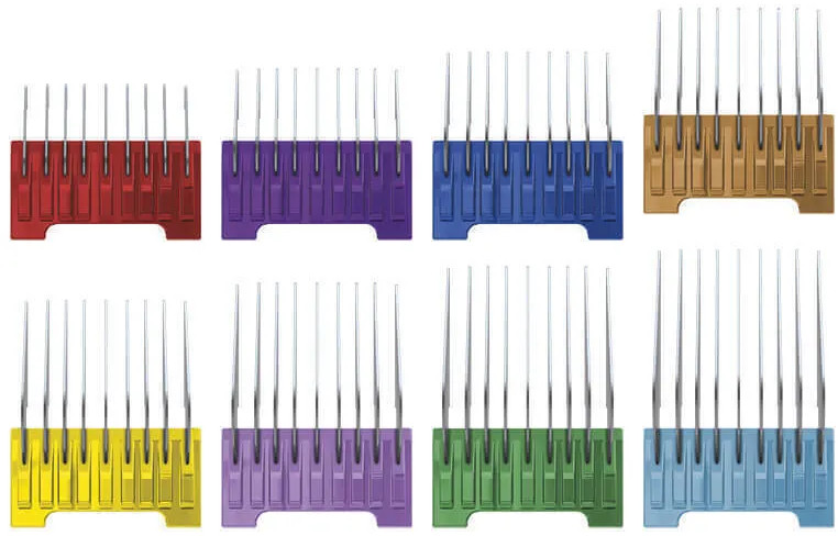 Применяя различные насадки, определите опытным путем желательную длину стрижки! У Вас есть выбор размеров от 3 до 25 мм. Простота в обращении благодаря тому, что насадки надвижные. Увеличенный срок службы благодаря прочным зубцам из нержавеющей стали. Насадка каждого размера имеет свой цвет, что упрощает поиск и выбор нужной вам насадки. Значительно лучшее проникновение в густые волосы благодаря тонким зубцам. Ввиду очень малой толщины стальные зубцы не перекрывают собой ход ножа, как это часто бывает с пластиковыми насадками (нет дорожек). Резко уменьшается вероятность пропуска волос или их защипывания. Удобный бокс для хранения в комплекте. По сравнению с обычными насадками значительно улучшены характеристики скольжения по волосам и коже головы. |