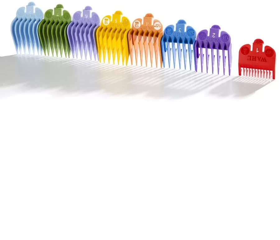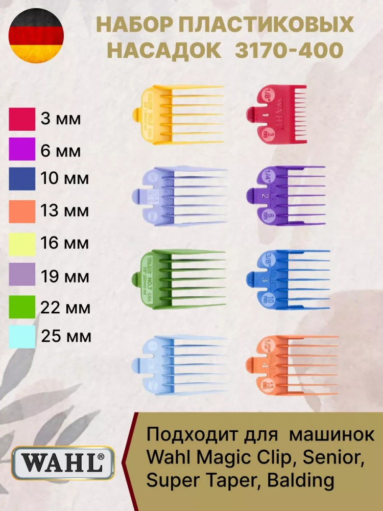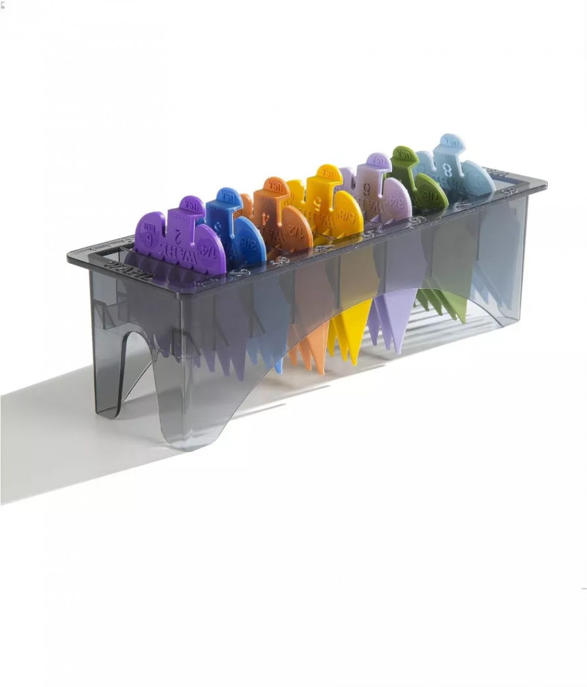 В данный момент этот товар отсутствует в продаже. Возможно, у нас найдется аналогичный или похожий товар здесь. Набор из восьми разноцветных пластиковых насадок Wahl Colored Cutting Guides 3170-400 подходит для машинок Wahl. Применяют для изменения длины стрижки от 3 до 25 мм. Цветные насадки Wahl разработаны для быстрого, гладкого и плавного скольжения через волосы или шерсть. Гребни без усилий крепятся на ноже и не соскакивают во время работы. Цветная маркировка помогает быстро выбрать насадку нужного размера. Не нужно искать цифры на насадке, чтобы получить необходимый размер.