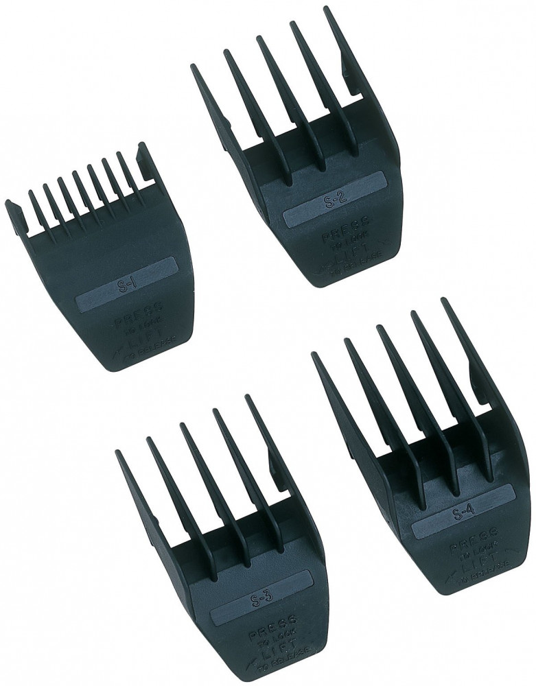 Комплект из четырех парикмахерских насадок изменяет длину среза от 3 до 13 мм. Барберы пользуются гребнями, чтобы выполнять стрижки, ухаживать за усами или бородой. Насадки надежно крепятся на ноже машинки и не соскакивают во время работы.