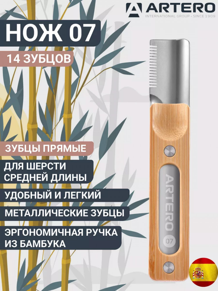 Нож для тримминга Артеро предназначен для профессионального ухода за шерстью домашних животных и используется для работы с жесткой и густой шерстью, а также плотным подшерстком. Он идеально подходит для удаления старой шерсти, создания четких линий и контуров, а также для придания шерсти здорового и ухоженного вида. Нож Artero изготовлен из высококачественной стали, что обеспечивает его прочность и долговечность. Лезвие ножа остро заточено и имеет специальное покрытие, которое предотвращает налипание шерсти и облегчает процесс стрижки. Нож обладает удобной рукояткой, которая обеспечивает надежный захват и комфорт при работе.