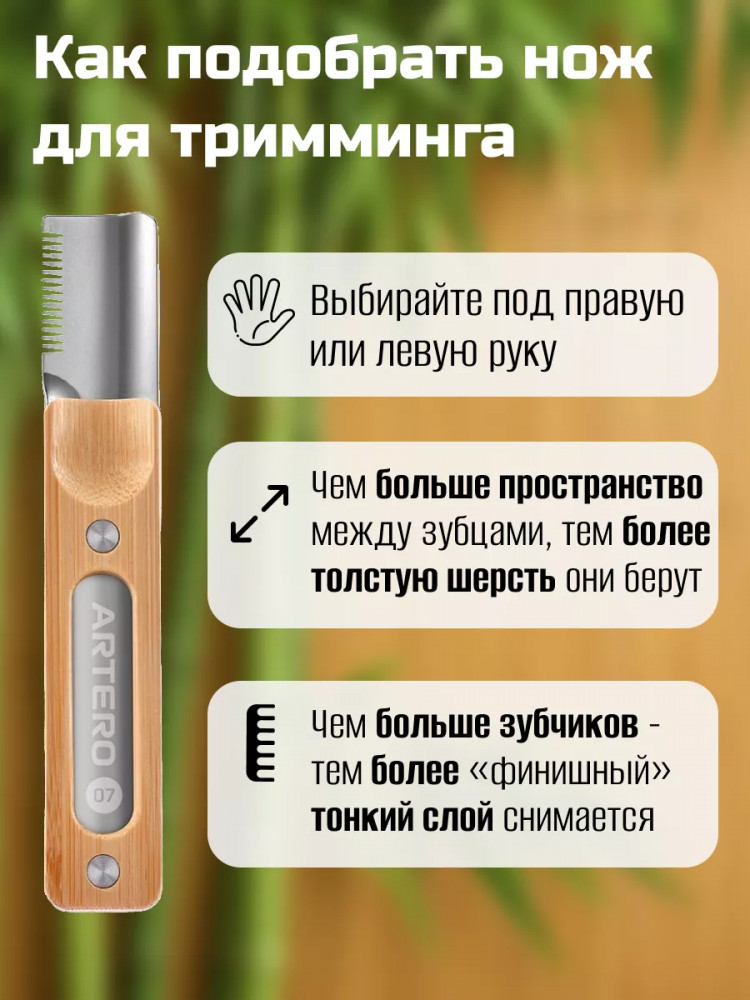 В данный момент этот товар отсутствует в продаже. Возможно, у нас найдется аналогичный или похожий товар здесь. Серия: Nature Collection Нож для тримминга Arterо для работы с жесткой шерстью и густым подшерстком. Нож хорошо лежит в руке, лёгкий. Отлично вычесывает подшерсток, не режет остевой волос. Глубокие, наклонные зубцы позволяют справляться с очень сложным подшерстком. Количество зубцов 14.