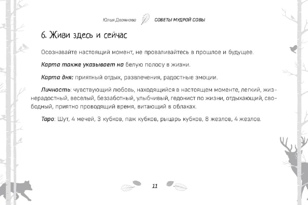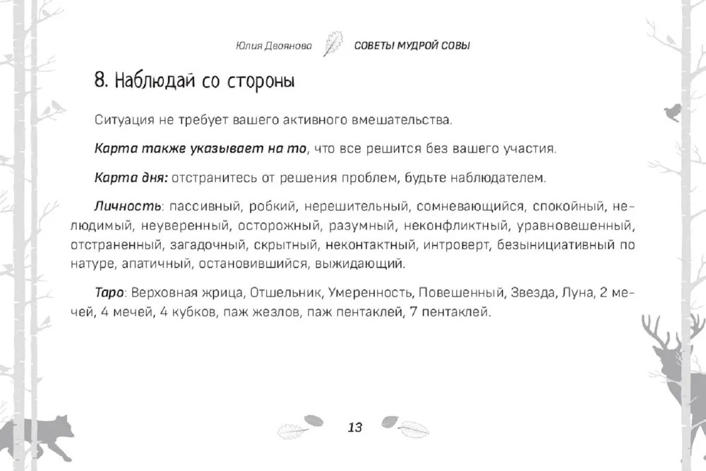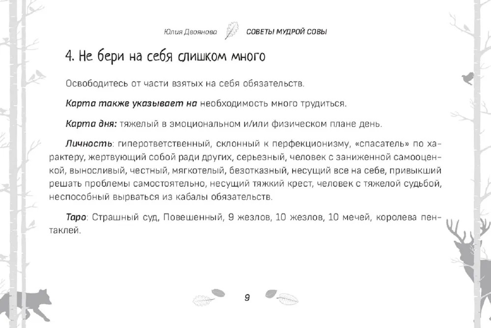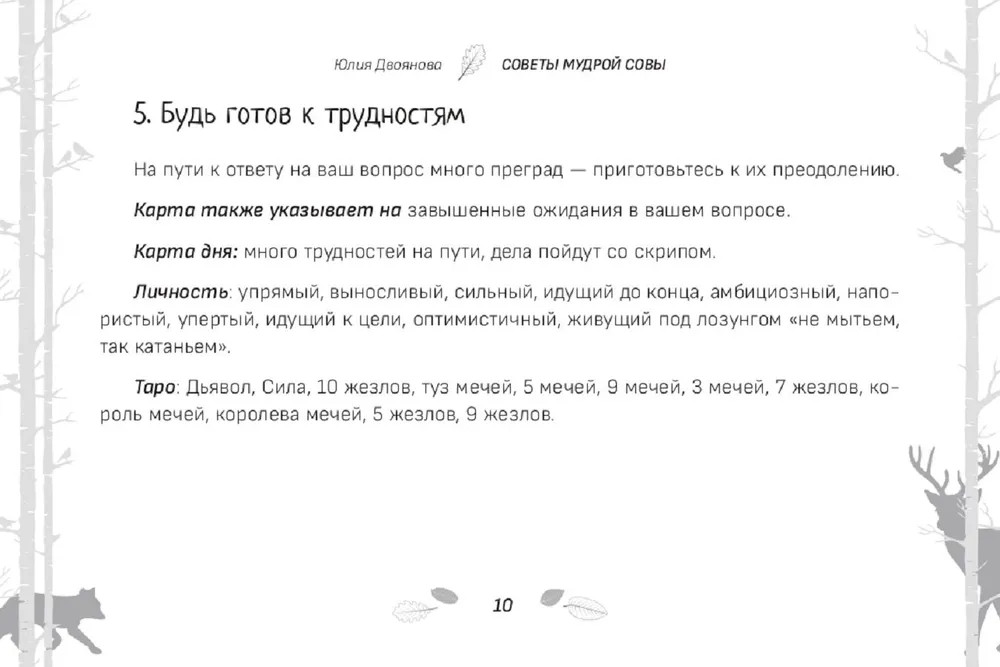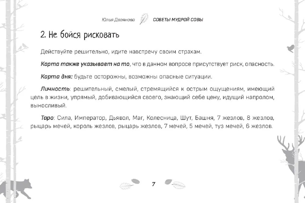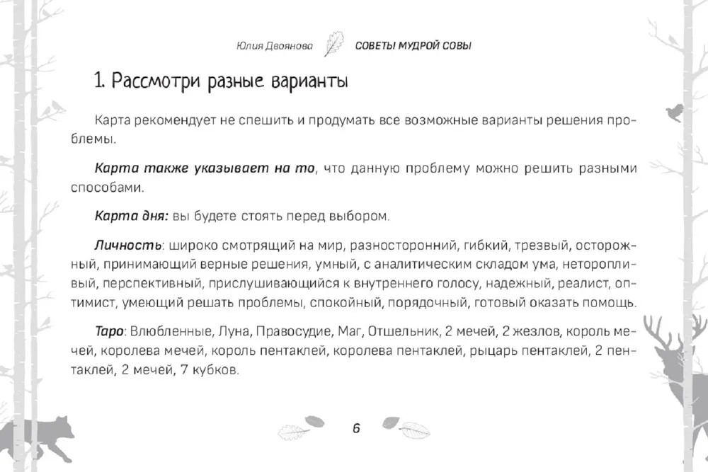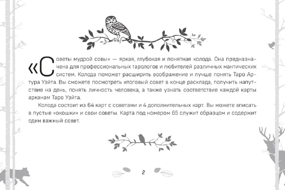 Таро «Советы мудрой совы»В данный момент этот товар отсутствует в продаже. Возможно, у нас найдется аналогичный или похожий товар здесь. Серия: Карты Таро «Советы мудрой совы» — яркая, глубокая и понятная колода. Она предназначена для профессиональных тарологов и любителей различных мантических систем. В колоде 64 карты с ясными и простыми советами на все случаи жизни (например, «Не бойся рисковать», «Живи здесь и сейчас», «Прояви терпение», «Тебе нужен отдых»). Карта под номером 65 содержит ещё одно важное послание и в то же время служит образцом для заполнения следующих 4 дополнительных карт. В пустые «окошки» карт под номерами 66-69 вы можете вписать советы, близкие именно вам. Благодаря своей структуре оракул универсален в работе и не требует специализированных знаний. |