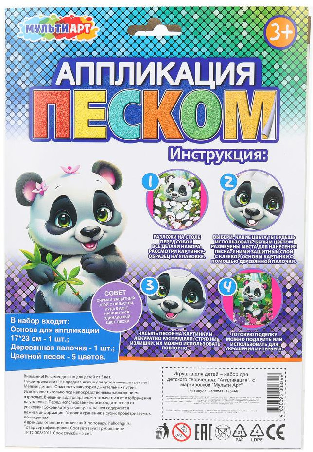 Multi Art Аппликация песком «Панда»В данный момент этот товар отсутствует в продаже. Возможно, у нас найдется аналогичный или похожий товар здесь. Набор для творчества — аппликация из песка «Панда» из серии «Сказочная мастерская» ТМ «Мульти Арт» — отличный подарок для ребёнка, который будет способствовать развитию его творческих способностей. С помощью красочной основы и разноцветного песка маленький художник сможет самостоятельно создать аппликацию с изображением милого котика. Готовую поделку можно подарить близким или использовать для украшения интерьера. |