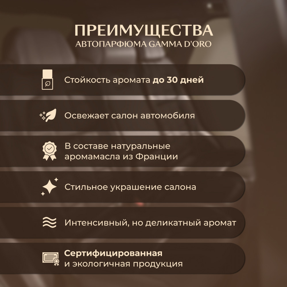 В каждый набор входит подарок — автопарфюм Gamma D’oro, который дополнит ваш стиль и в дороге. Этот изысканный ароматизатор для автомобиля действует как утончённый освежитель для автомобиля, придавая салону свежесть и характер. Удобный диффузор для автомобиля легко размещается в салоне, стойкий ароматизатор в машину наполняет пространство благородным ароматом. Стильный ароматизатор в автомобиль станет отличным дополнением к вашему образу и подарит комфорт в каждой поездке.