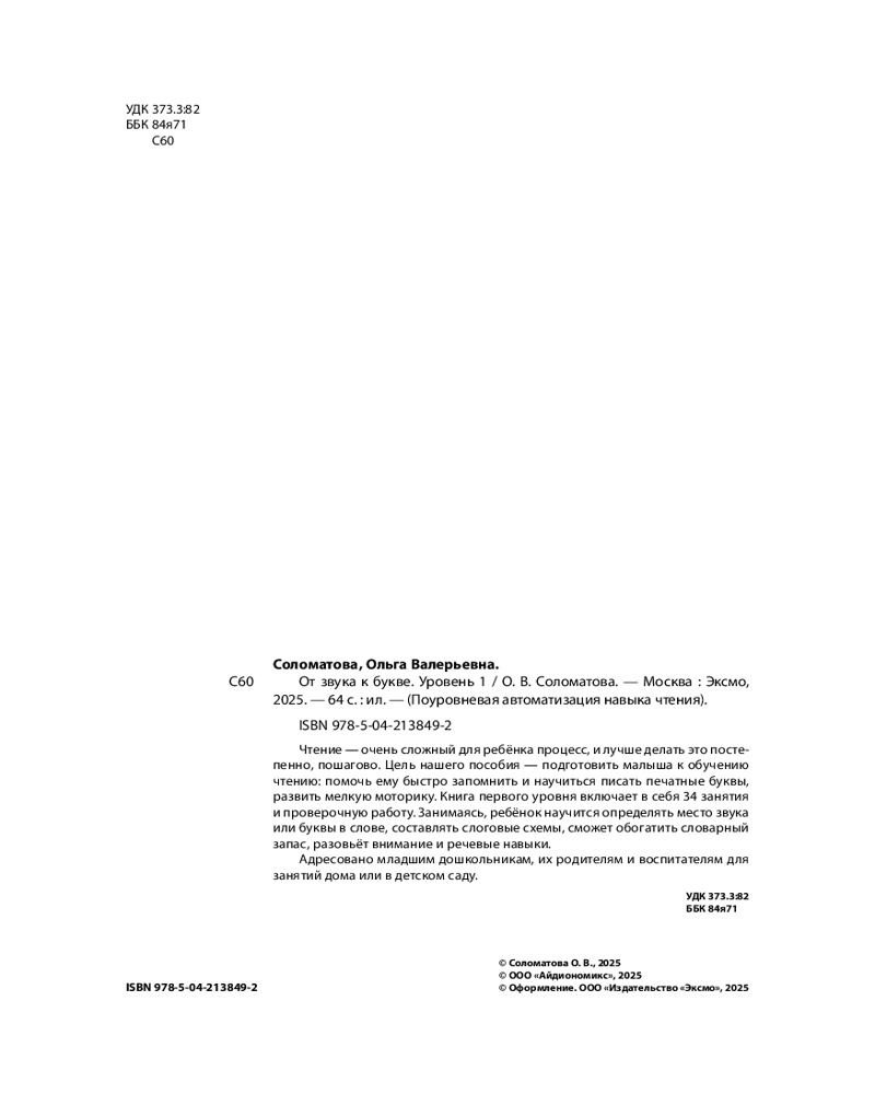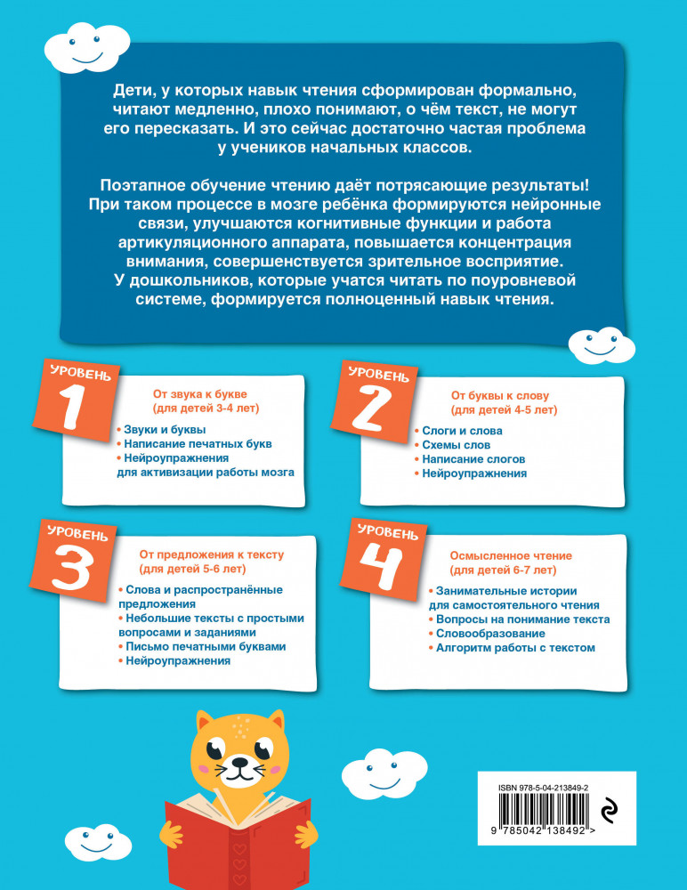 💳 Оплатить за товар можно при получении 🇰🇿 Есть бесплатная доставка по Казахстану 🎁 Копите бонусы с каждой покупки Серия: Поуровневая автоматизация навыка чтения Чтобы довести навык чтения до автоматизма, важно пройти все основные уровни обучения, ничего не пропуская. Книга первого уровня предназначена для детей, которые не знают букв или знают некоторые из них. Благодаря комплексному подходу и регулярным тренировкам у ребенка сформируются первоначальные навыки чтения и письма. Упражнения внутри каждой темы построены по принципу от простого к сложному, поэтому, чтобы достичь успеха, выполнять их нужно по порядку. Занимаясь, малыш овладеет новыми умениями и навыками, и постепенно у него сформируется интерес к чтению. Что-то будет даваться легко, что-то сначала покажется сложным, но упорство и старание непременно приведут к отличному результату. |