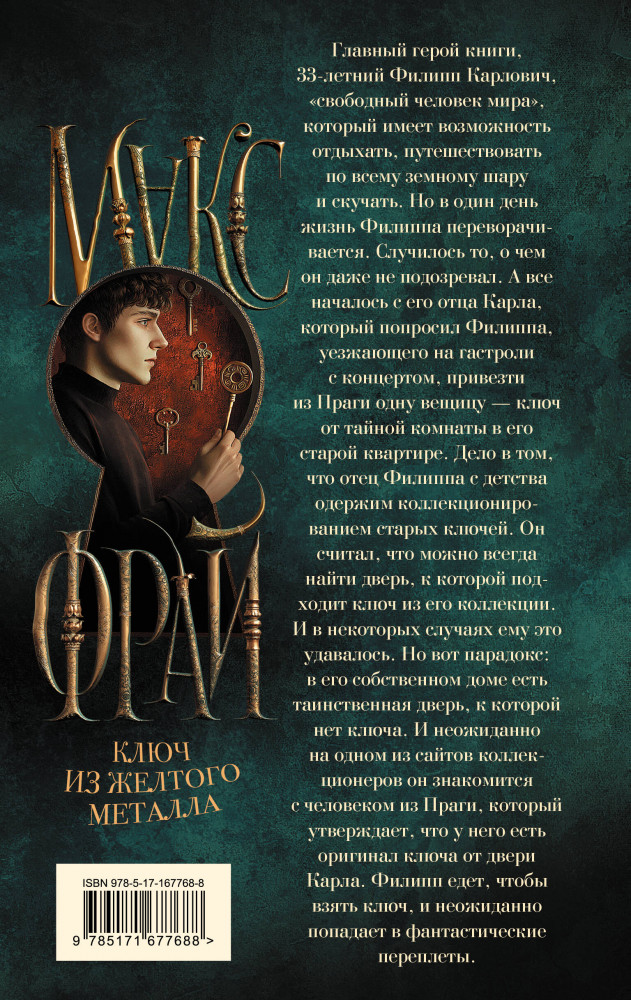 💳 Оплатить за товар можно при получении 🇰🇿 Есть бесплатная доставка по Казахстану от 1 дня 🎁 Копите бонусы с каждой покупки Серия: Миры Макса Фрая (илл. Ферез) «Ключ из желтого металла» — книга для тех, кто любит разгадывать тайные шифры, скрытые в древних знаках и предметах. Главный герой книги, 33-летний Филипп Карлович, «свободный человек мира», который имеет возможность отдыхать, путешествовать по всему земному шару и скучать. Но в один день жизнь Филиппа переворачивается. Случилось то, о чем он даже не подозревал. А все началось с его отца Карла, который попросил Филиппа, уезжающего на гастроли с концертом, привезти из Праги одну вещицу — ключ от тайной комнаты в его старой квартире. Дело в том, что отец Филиппа с детства одержим коллекционированием старых ключей. Он считал, что можно всегда найти дверь, к которой подходит ключ из его коллекции. И в некоторых случаях ему это удавалось. Но вот парадокс: в его собственном доме есть таинственная дверь, к которой нет ключа. И неожиданно на одном из сайтов коллекционеров он знакомится с человеком из Праги, который утверждает, что у него есть оригинал ключа от двери Карла. Филипп едет, чтобы взять ключ, и неожиданно попадает в фантастические переплеты. |