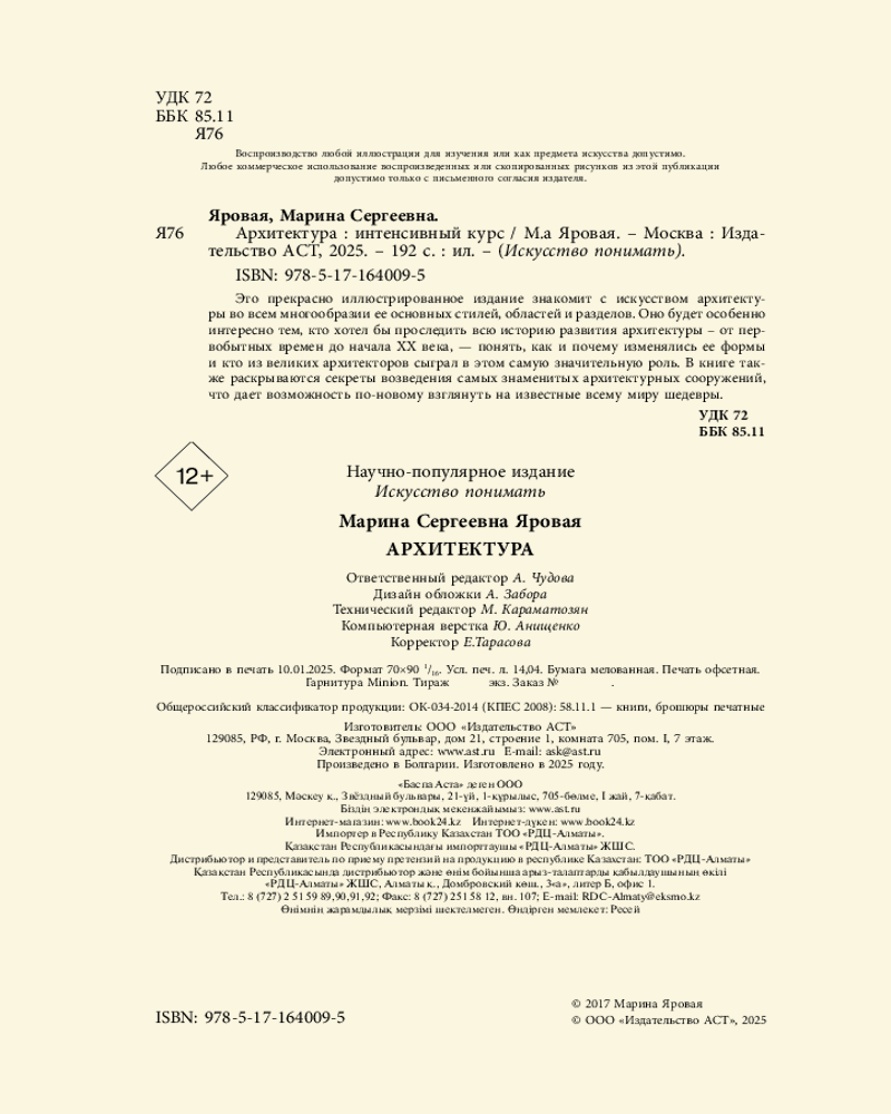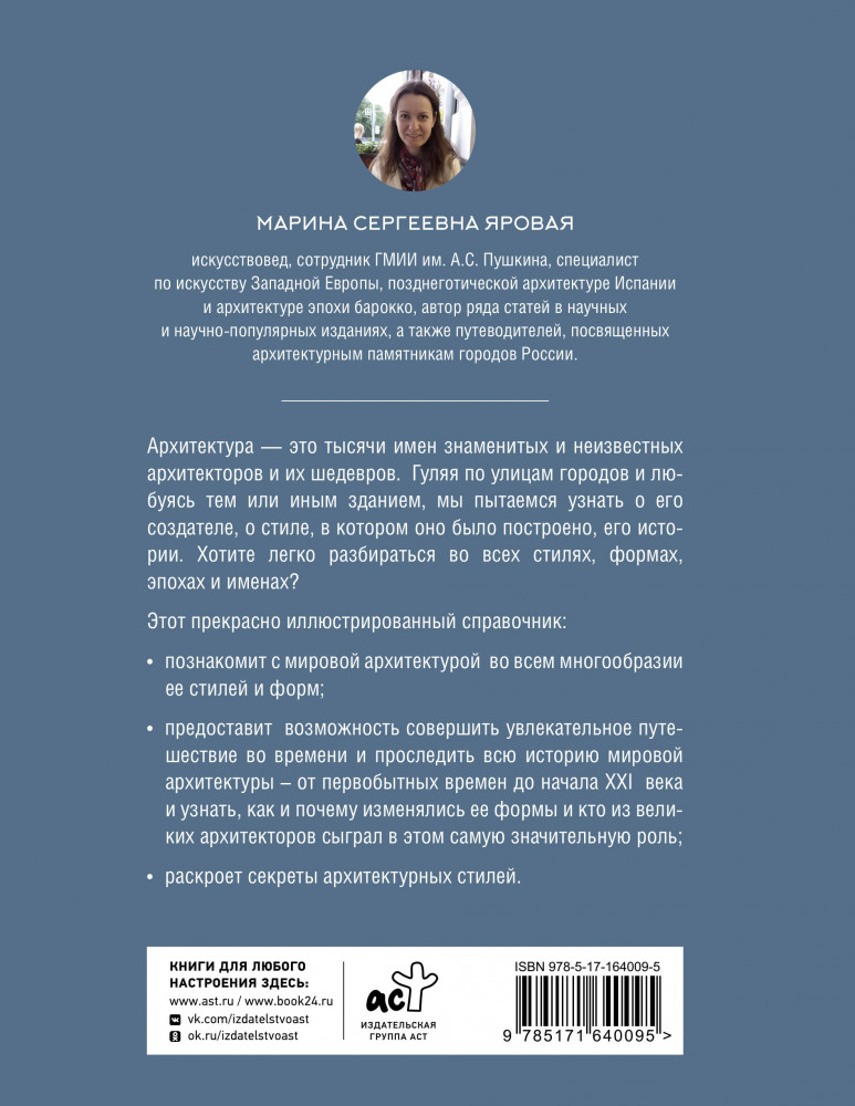 💳 Оплатить за товар можно при получении 🇰🇿 Есть бесплатная доставка по Казахстану от 1 дня 🎁 Копите бонусы с каждой покупки Серия: Искусство понимать Архитектура — это тысячи имен знаменитых архитекторов и множество безымянных шедевров мировой архитектуры. Проходя по улицам городов, мы останавливаемся перед понравившимся нам зданием, пытаясь узнать хотя бы немного о его создателе, о стиле, в котором оно было построено. Хотите легко разбираться во всех стилях, эпохах и именах? |