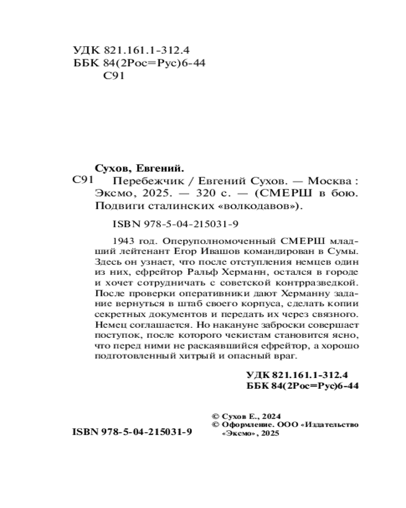💳 Оплатить за товар можно при получении 🇰🇿 Есть бесплатная доставка по Казахстану от 1 дня 🎁 Копите бонусы с каждой покупки Серия: СМЕРШ в бою. Подвиги сталинских «волкодавов» 1943 год. Оперуполномоченный СМЕРШа младший лейтенант Егор Ивашов командирован в Сумы. Здесь он узнает, что после отступления немцев один из них, ефрейтор Ральф Херманн, остался в городе и хочет сотрудничать с советской контрразведкой. После проверки оперативники дают Херманну задание вернуться в штаб своего корпуса, сделать копии секретных документов и передать их через связного. Немец соглашается. Но накануне заброски совершает поступок, после которого чекистам становится ясно, что перед ними не раскаявшийся ефрейтор, а хорошо подготовленный, хитрый и опасный враг. |