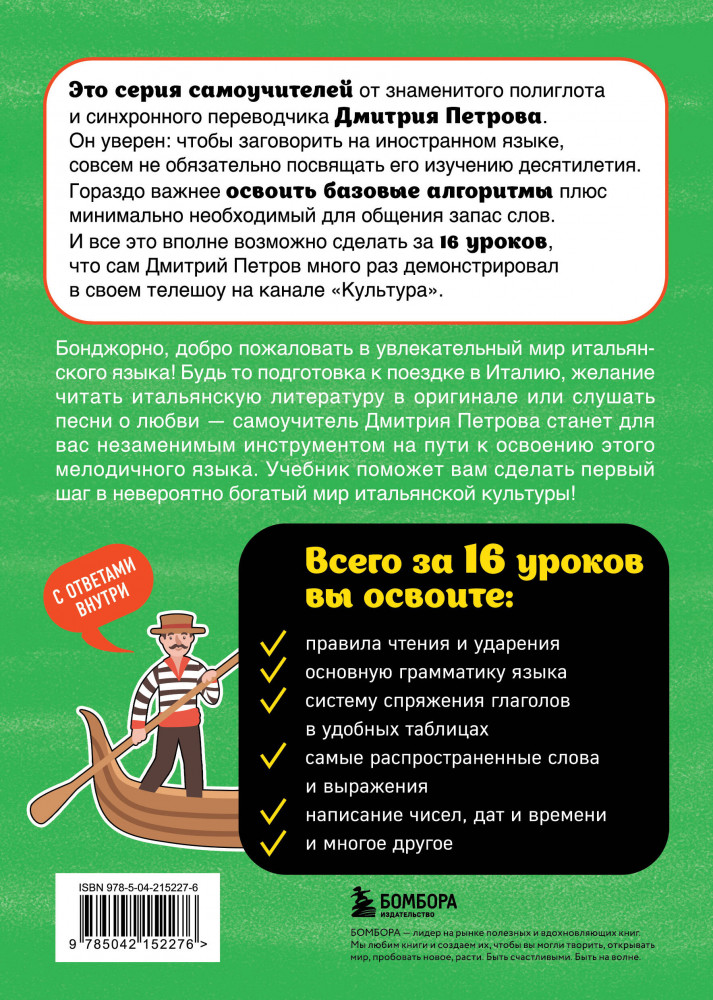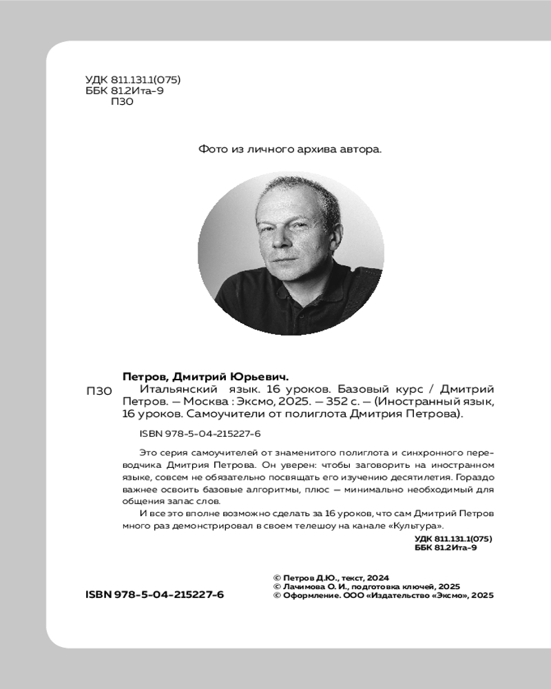 💳 Оплатить за товар можно при получении 🇰🇿 Есть бесплатная доставка по Казахстану от 1 дня 🎁 Копите бонусы с каждой покупки Серия: Иностранный язык, 16 уроков. Самоучители от полиглота Дмитрия Петрова Это серия самоучителей от знаменитого полиглота и синхронного переводчика Дмитрия Петрова. Он уверен: чтобы заговорить на иностранном языке, совсем не обязательно посвящать его изучению десятилетия. Гораздо важнее освоить базовые алгоритмы, плюс — минимально необходимый для общения запас слов. |