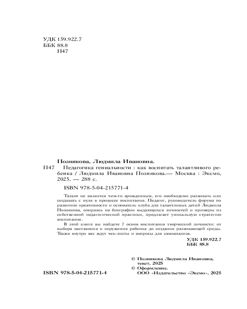💳 Оплатить за товар можно при получении 🇰🇿 Есть бесплатная доставка по Казахстану от 1 дня 🎁 Копите бонусы с каждой покупки Серия: Психология. Воспитание с любовью и пониманием Мы воспринимаем гениальность как «дар свыше», но что, если воспитать гения может каждый? Людмила Познякова, педагог, руководитель форума по развитию креативности и основатель клуба для талантливых детей, знает, как развить с нуля талант вашего ребенка. Опираясь на многочисленные примеры из собственной практики и биографии выдающихся личностей, автор предлагает уникальную стратегию воспитания и наглядно показывает, какие ошибки могут помешать ребенку раскрыть свой потенциал. |