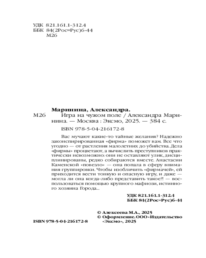 💳 Оплатить за товар можно при получении 🇰🇿 Есть бесплатная доставка по Казахстану 🎁 Копите бонусы с каждой покупки Серия: А.Маринина. Больше чем детектив. Новое оформление (клатчбук) Вас мучают какие-то тайные желания? Надежно законспирированная «фирма» поможет вам. Все, что угодно — от растления малолетних до убийства. Дела «фирмы» процветают, а вычислить преступников практически невозможно: они не оставляют улик, дисциплинированны, редко собираются вместе. Анастасии Каменской «повезло» — она попала в сферу внимания группировки. Чтобы изобличить «фирмачей», ей приходится вести тонкую и опасную игру, и даже — могла ли она когда-либо представить такое?! — воспользоваться помощью крупного мафиози, истинного хозяина Города... |