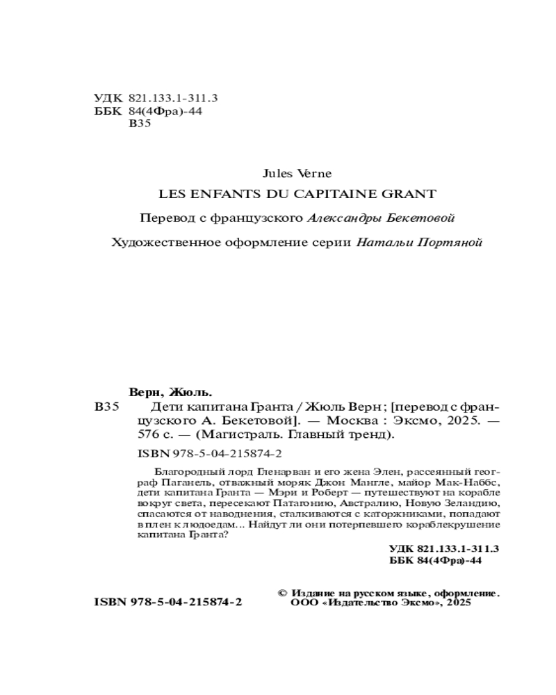 💳 Оплатить за товар можно при получении 🇰🇿 Есть бесплатная доставка по Казахстану от 1 дня 🎁 Копите бонусы с каждой покупки Серия: Магистраль. Главный тренд Одно из лучших произведений в истории приключенческой литературы. Неоднократно экранизированный увлекательный роман, вот уже полтора века одинаково любимый читателями всех возрастов во всех странах мира. Благородный лорд Гленарван и его жена Элен, рассеянный географ Паганель, отважный моряк Джон Мангле, майор Мак-Наббс, дети капитана Гранта — Мэри и Роберт — путешествуют на корабле вокруг света, пересекают Патагонию, Австралию, Новую Зеландию, спасаются от наводнения, сталкиваются с каторжниками, попадают в плен к людоедам... Найдут ли они потерпевшего кораблекрушение капитана Гранта? |